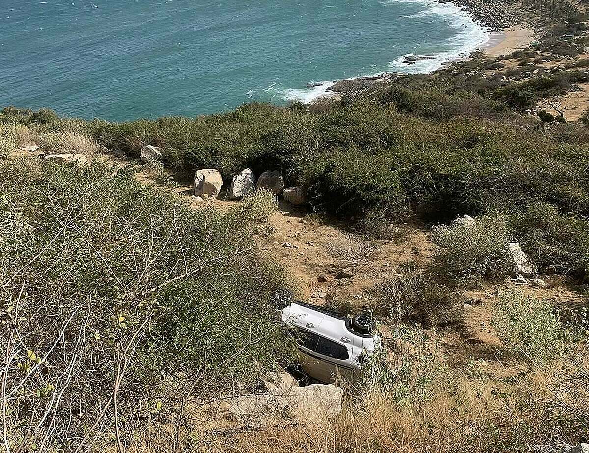 Around 3 p.m., a 4-seater car driven by a male driver, carrying a middle-aged couple, was traveling on the coastal DT701 road from Ninh Thuan towards Cam Ranh. Upon reaching a pass section in Phuoc Dinh commune, the car collided with a motorbike parked on the roadside. The impact caused both vehicles to tumble multiple times, falling over 4 meters into a ravine, resulting in severe damage.