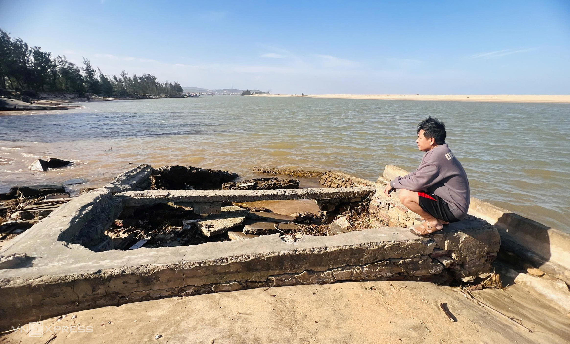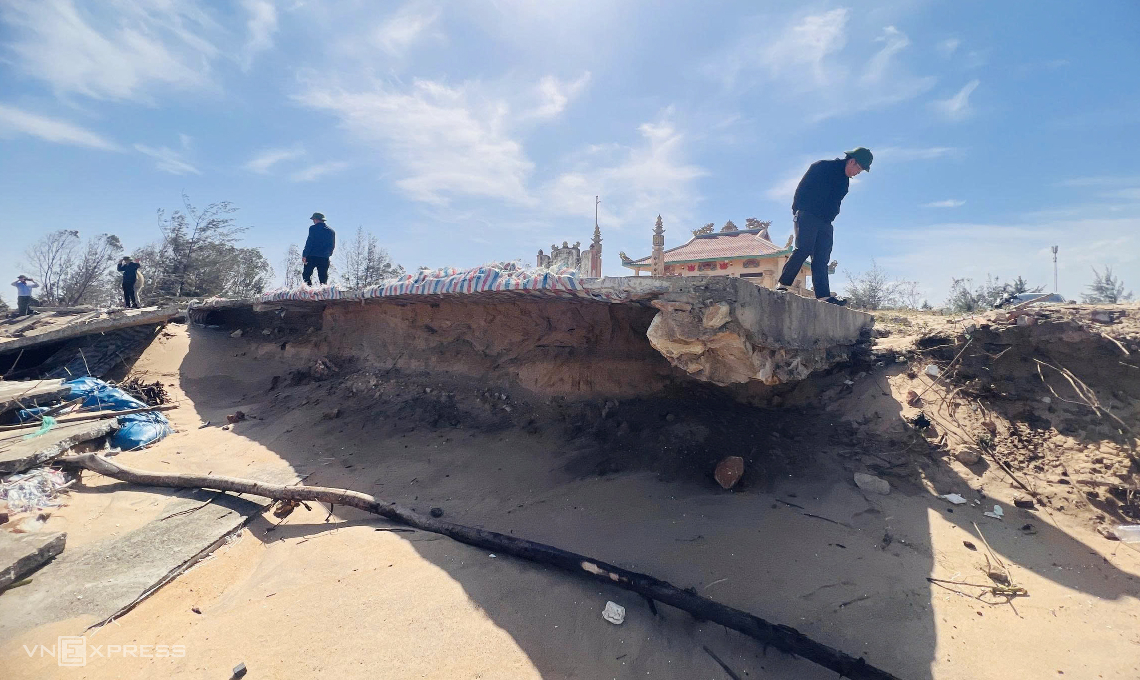 Nearly 90 km north of Trung Giang beach, the Quang Phu - Hai Thanh dike on the Nhat Le river in Dong Hoi ward has also collapsed due to waves. The 868 m dike, with a total capital of 35 billion VND, was built in 2021. Over 700 m of it collapsed before acceptance testing was complete.
