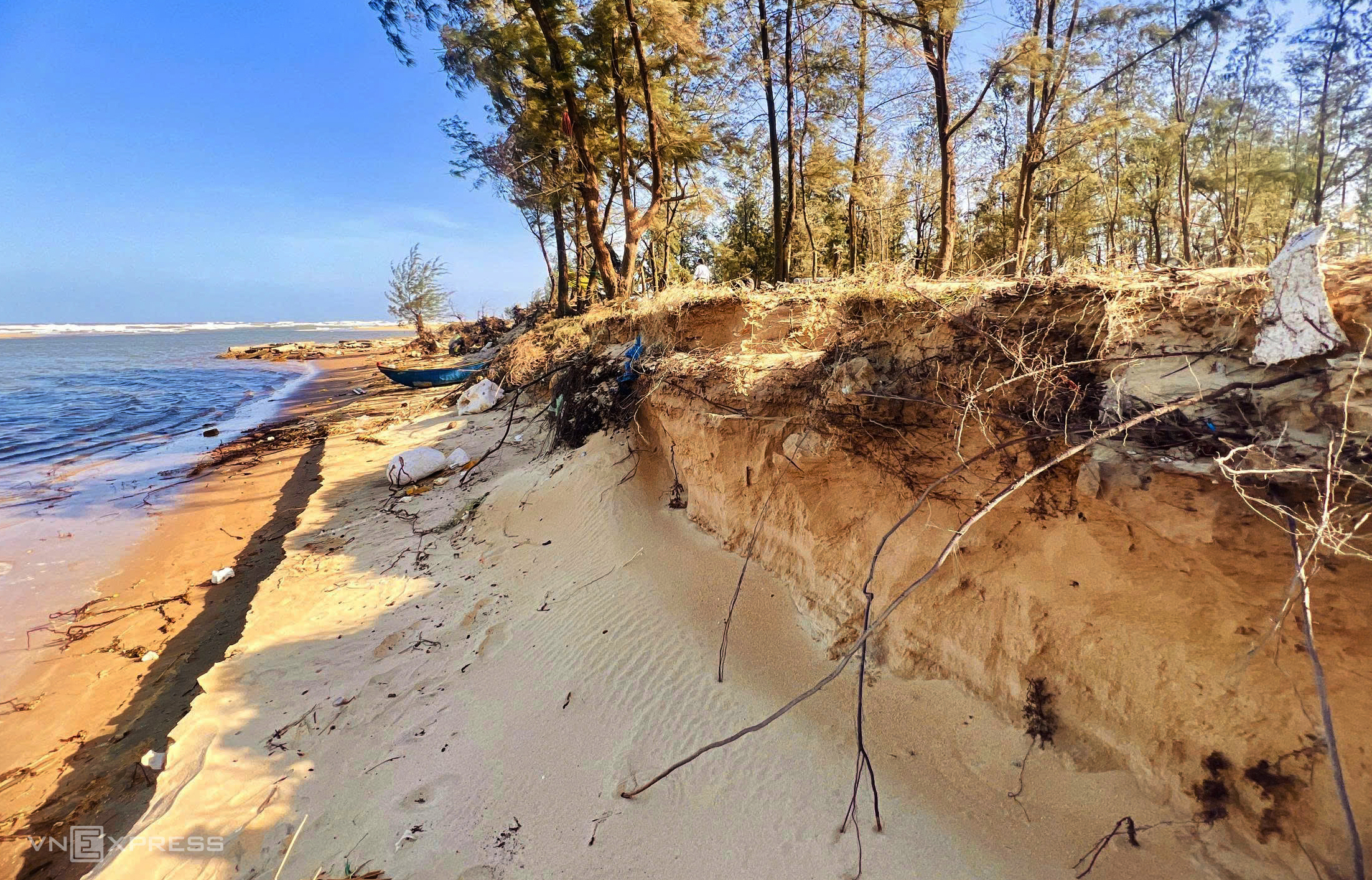 Nearly 30 km north of the Hai Thanh - Quang Phu dike, the coastline of Bac Trach commune is experiencing erosion along approximately 7 km. During each storm season, the casuarina forest, which acts as a wave barrier, is washed out to sea, threatening about 450 households with nearly 1,800 people in the commune.