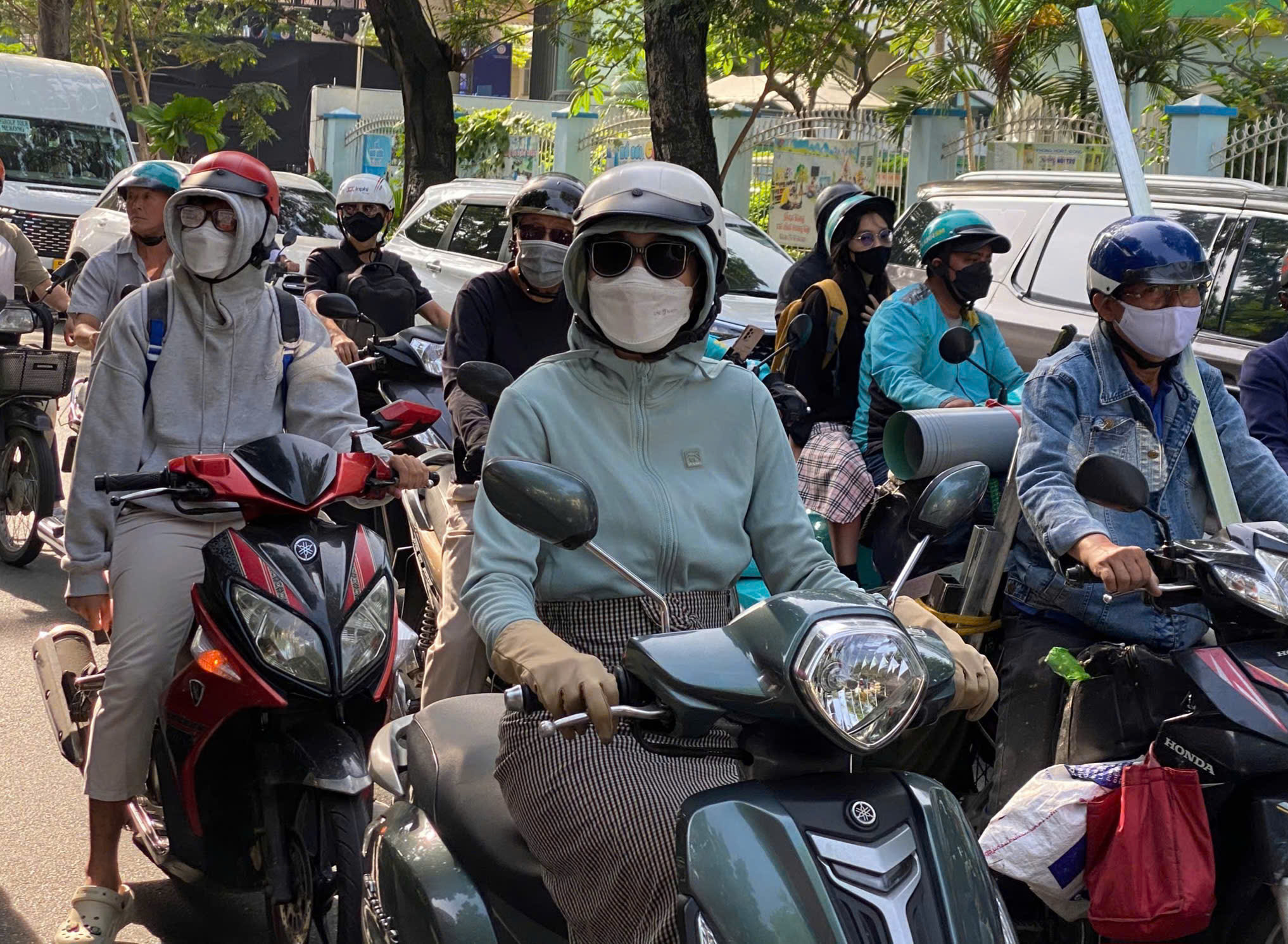 Motorcyclists wear extra jackets on Truong Dinh street as Ho Chi Minh City's temperature drops to 21°C on the morning of 27/11.
