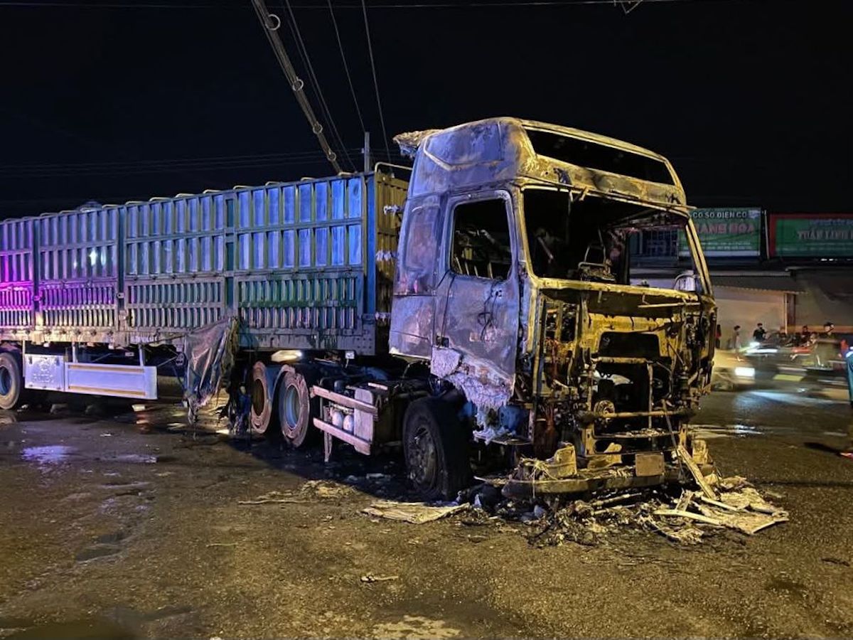 Around 9 p.m. on 22/1, a container truck traveling on national highway 1 collided with a motorcycle driven by a woman carrying two small children as it turned towards Phuoc Tan ward, Bien Hoa. The impact knocked all three people onto the road, and the front of the container truck suddenly caught fire.