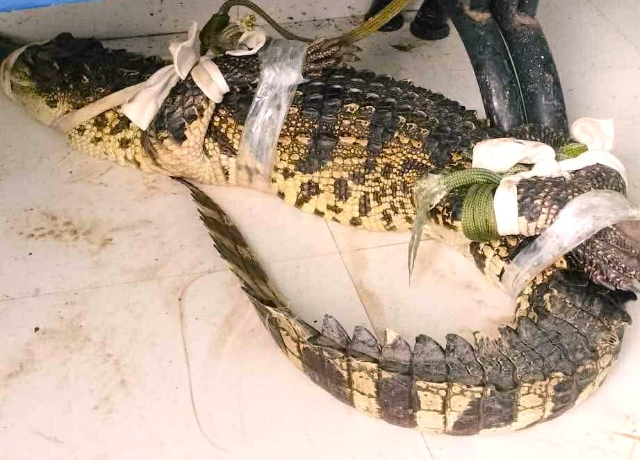 Four residents used live fish as bait, luring the crocodile into a pond about 20 meters from its initial location. They then set a trap to catch it. Approximately 30 minutes later, the animal was subdued and tied up.