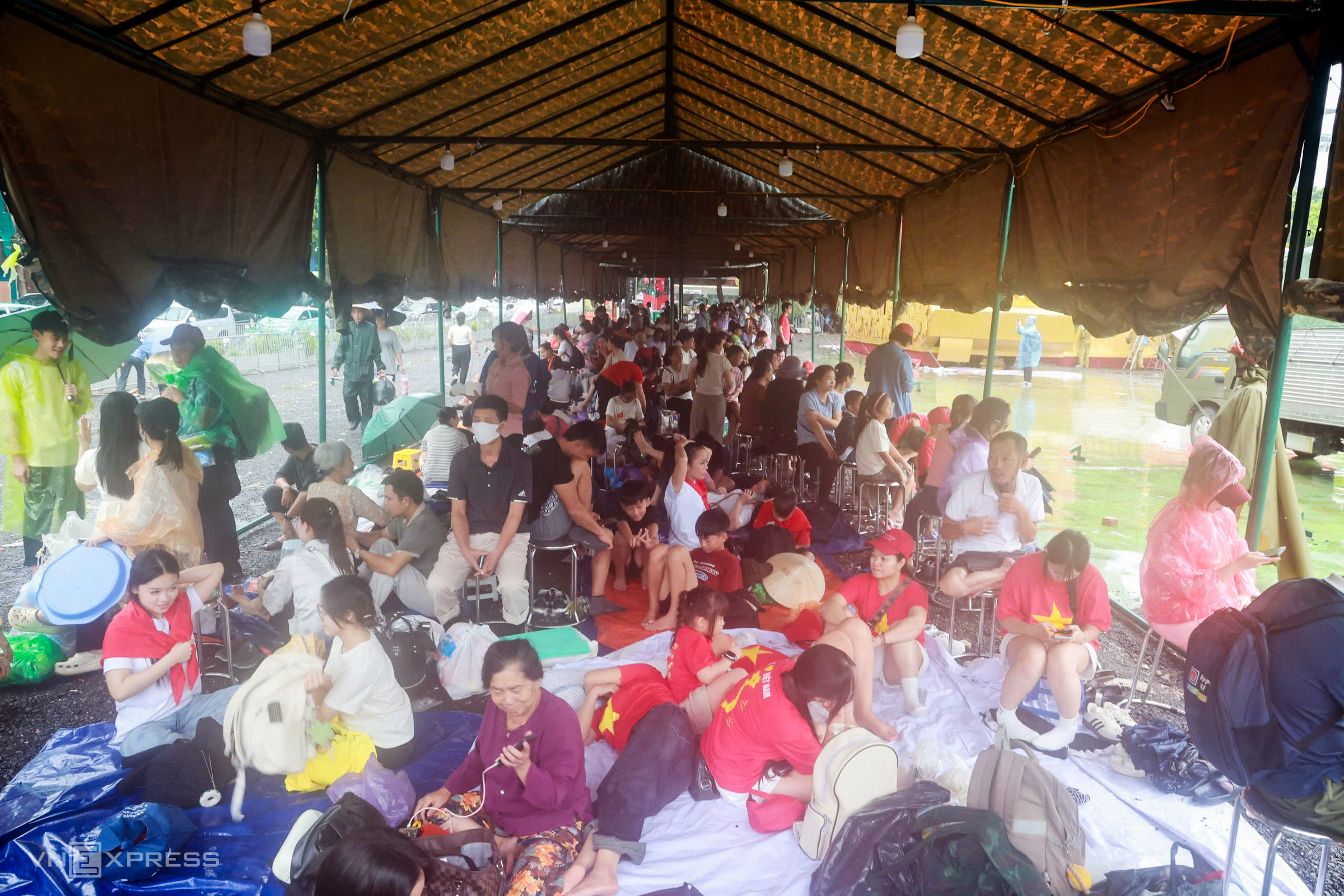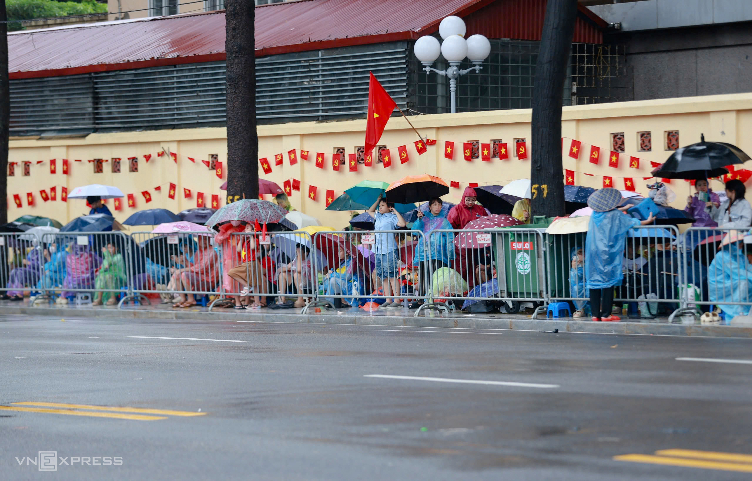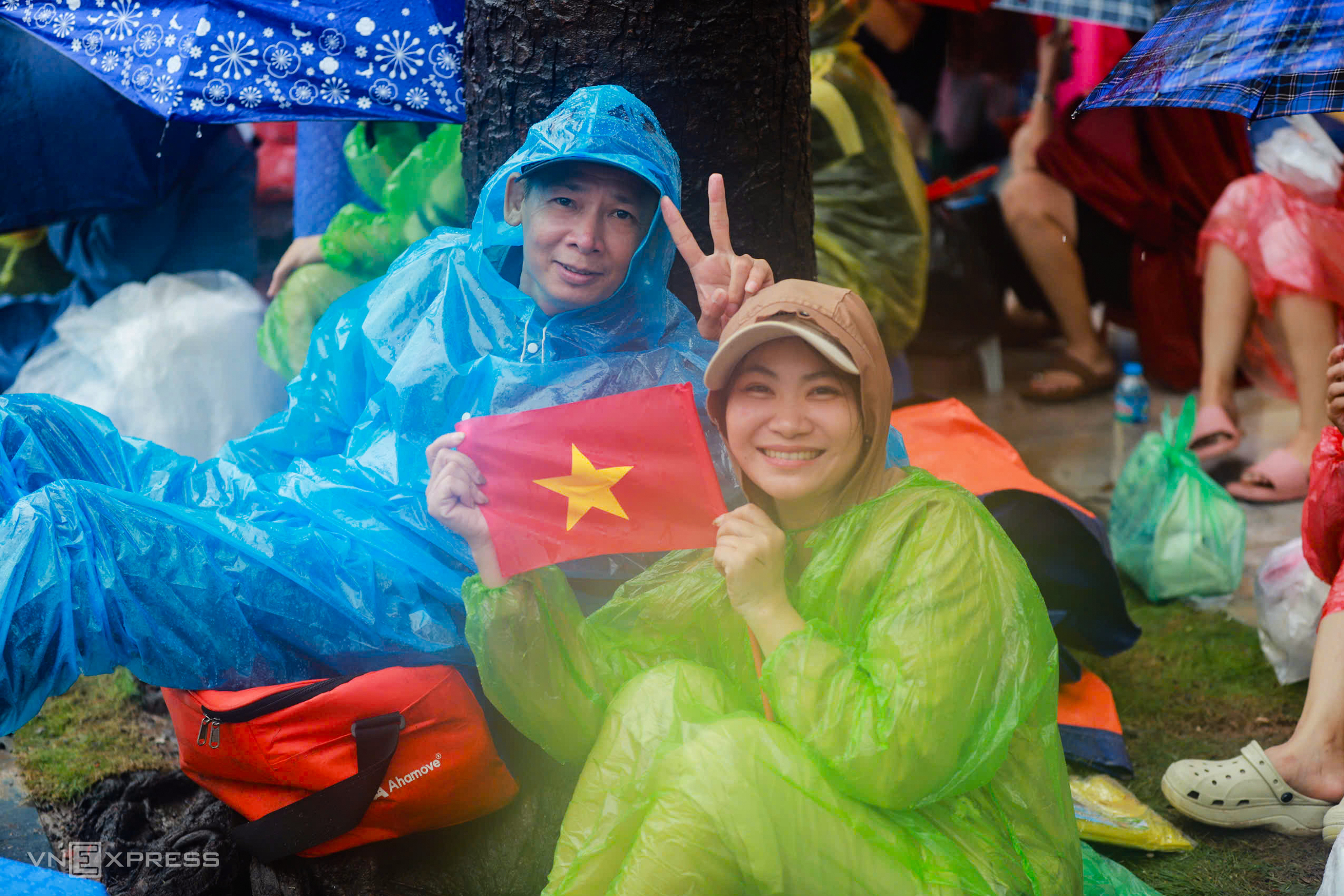 Mr. Dung, 43, arrived with his wife at 2 a.m. on Hung Vuong street. He said they had prepared food and drinks. "It was raining heavily when we left, but we persevered. I came early to find a spot with a good view to see everything." Photo: Vo Thanh