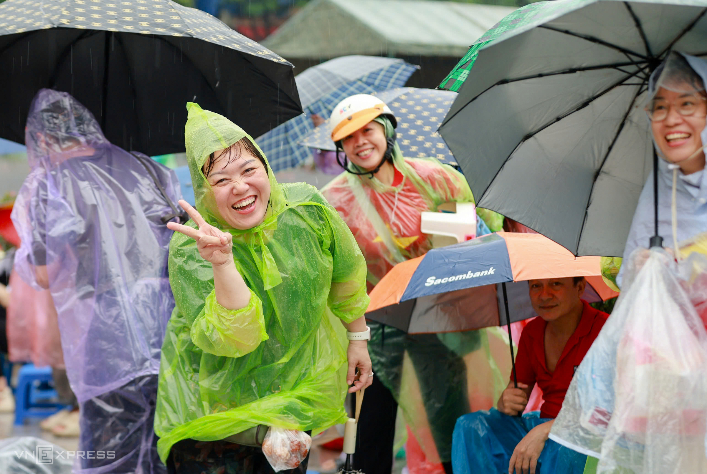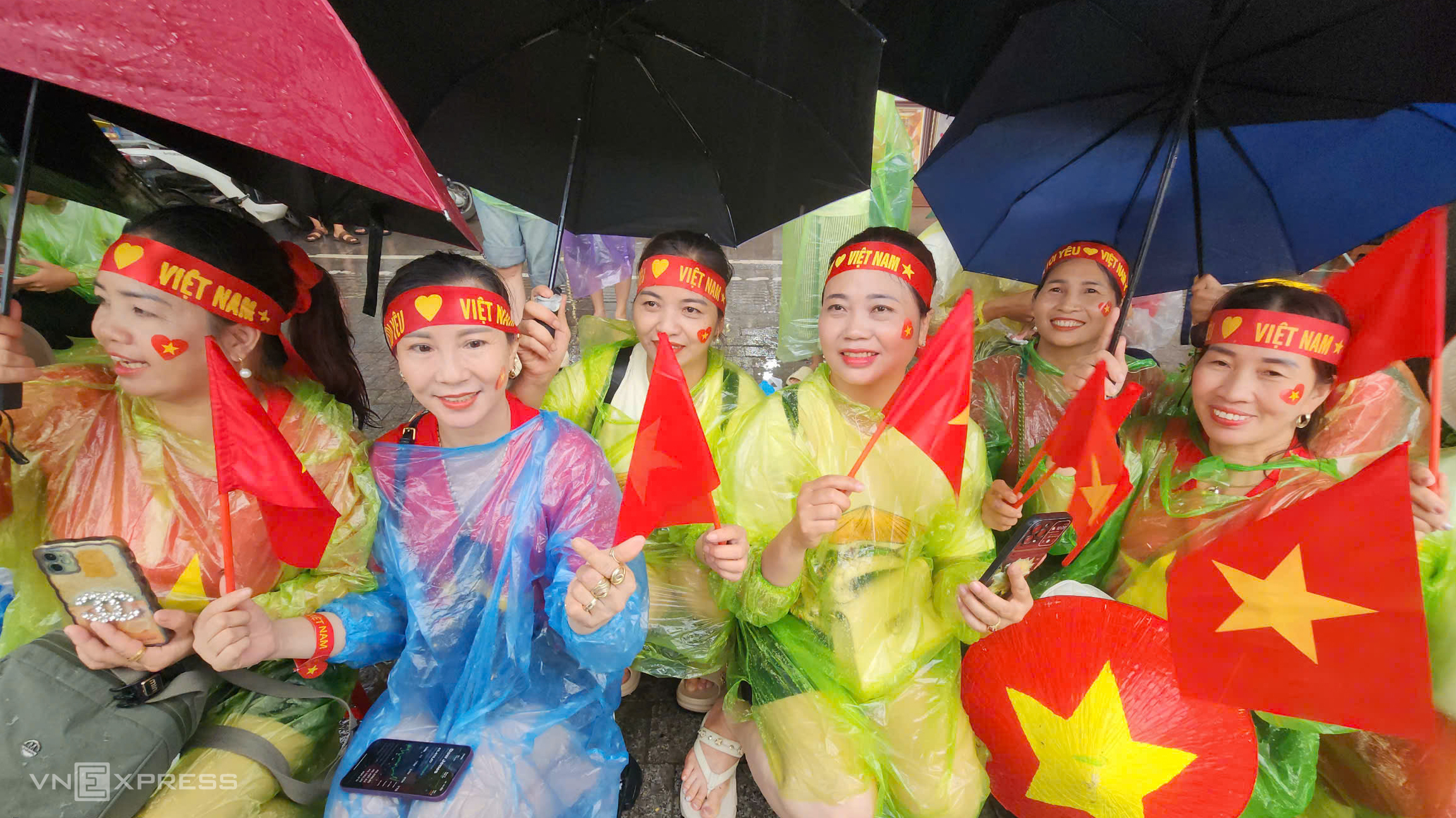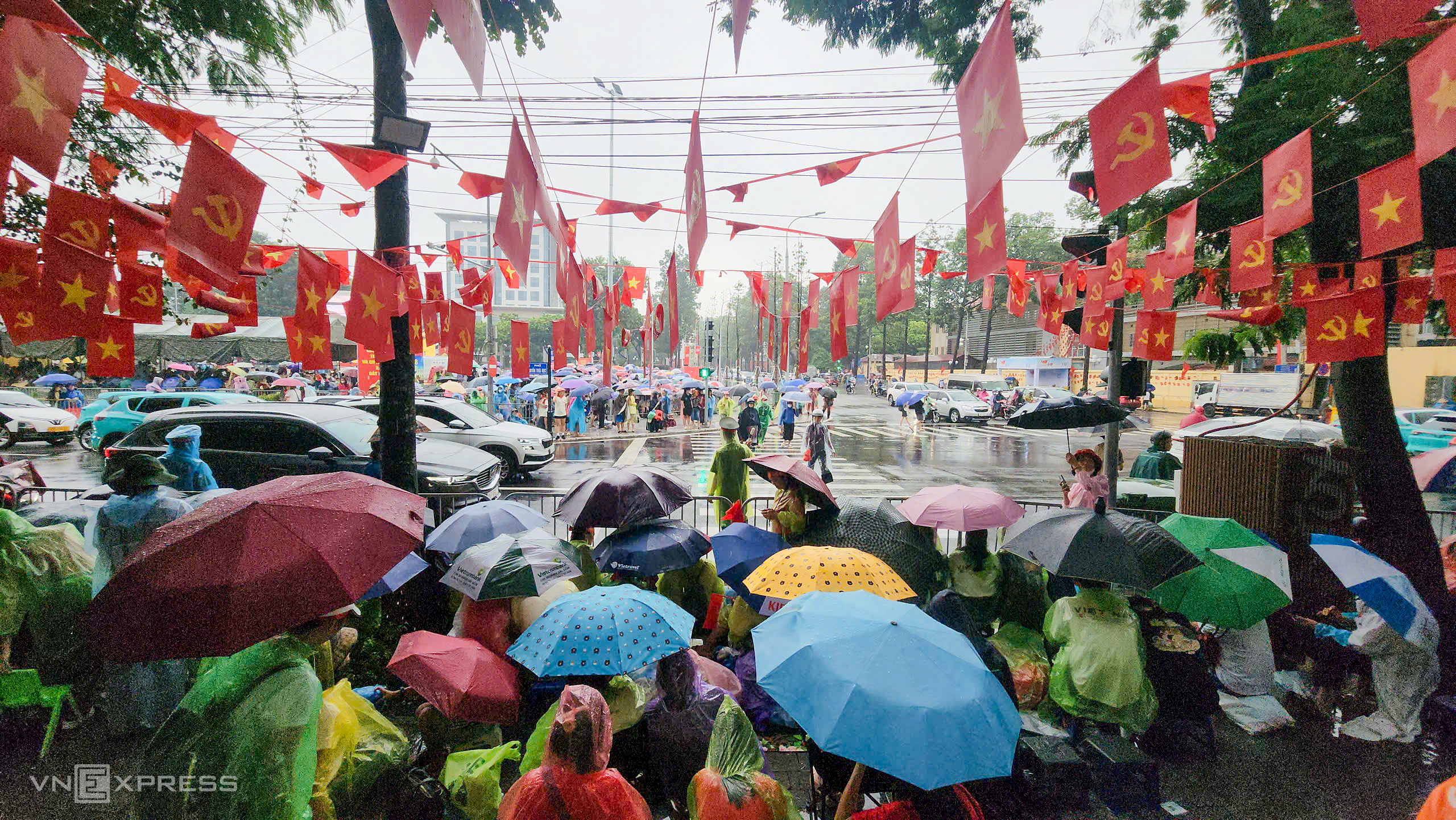 Mr. Dung, 43, arrived with his wife at 2 a.m. on Hung Vuong street. He said they had prepared food and drinks. "It was raining heavily when we left, but we persevered. I came early to find a spot with a good view to see everything." Photo: Vo Thanh