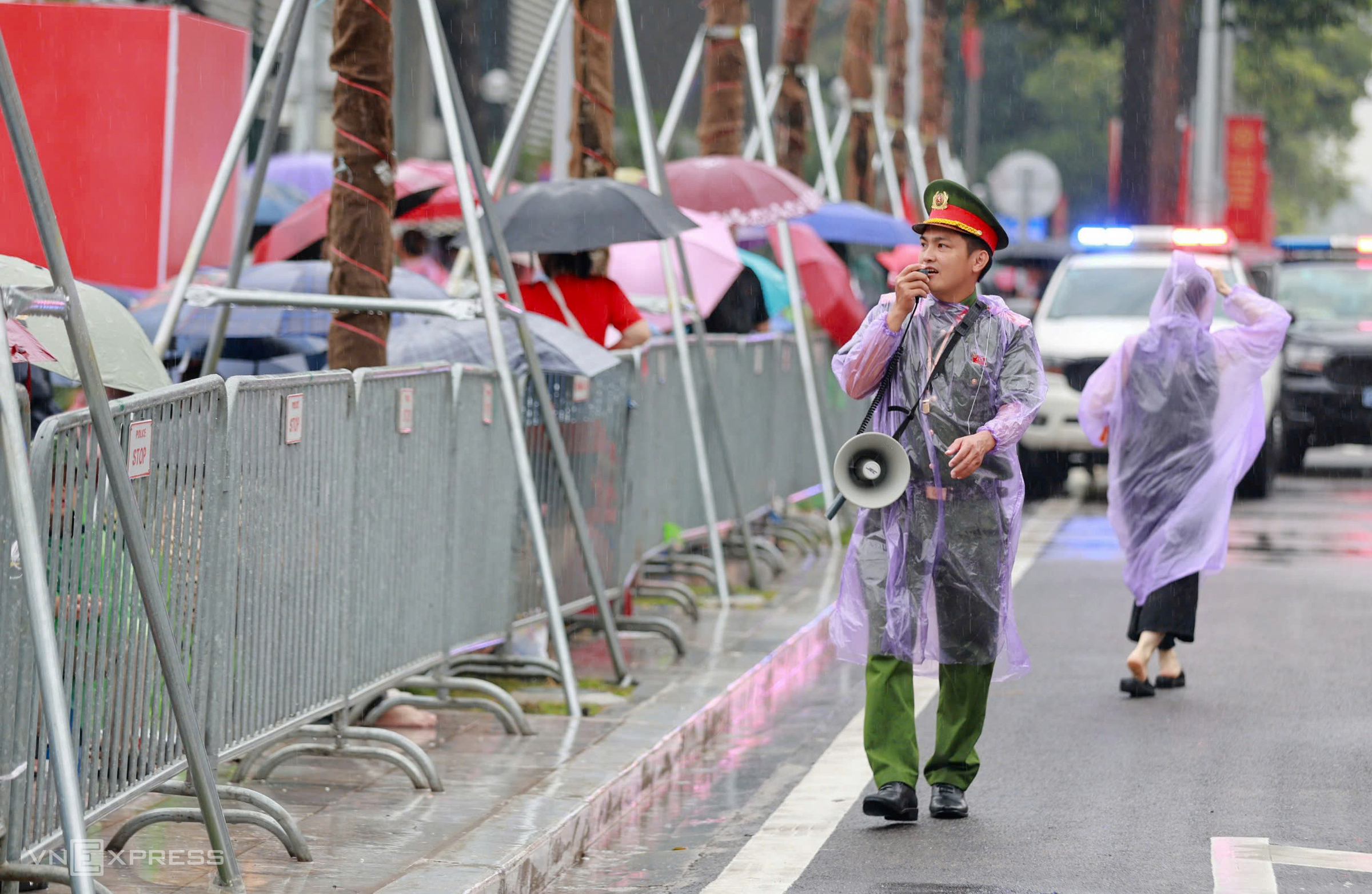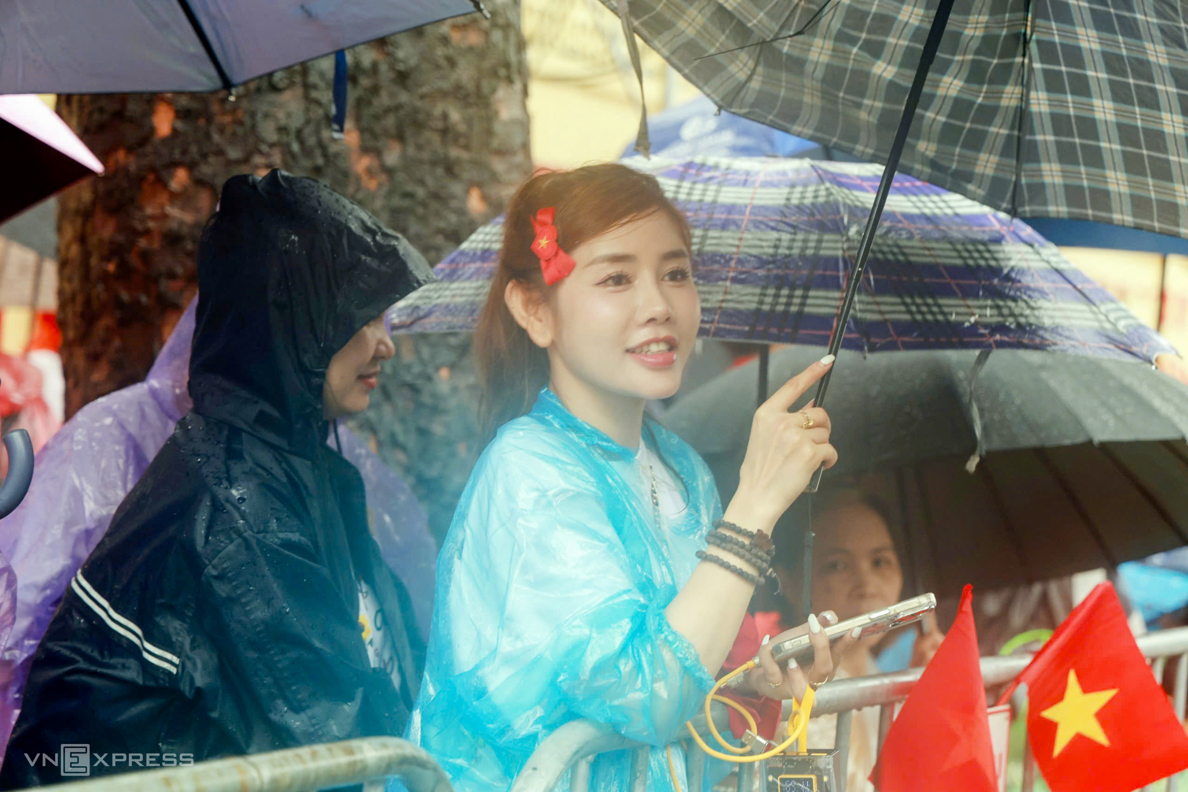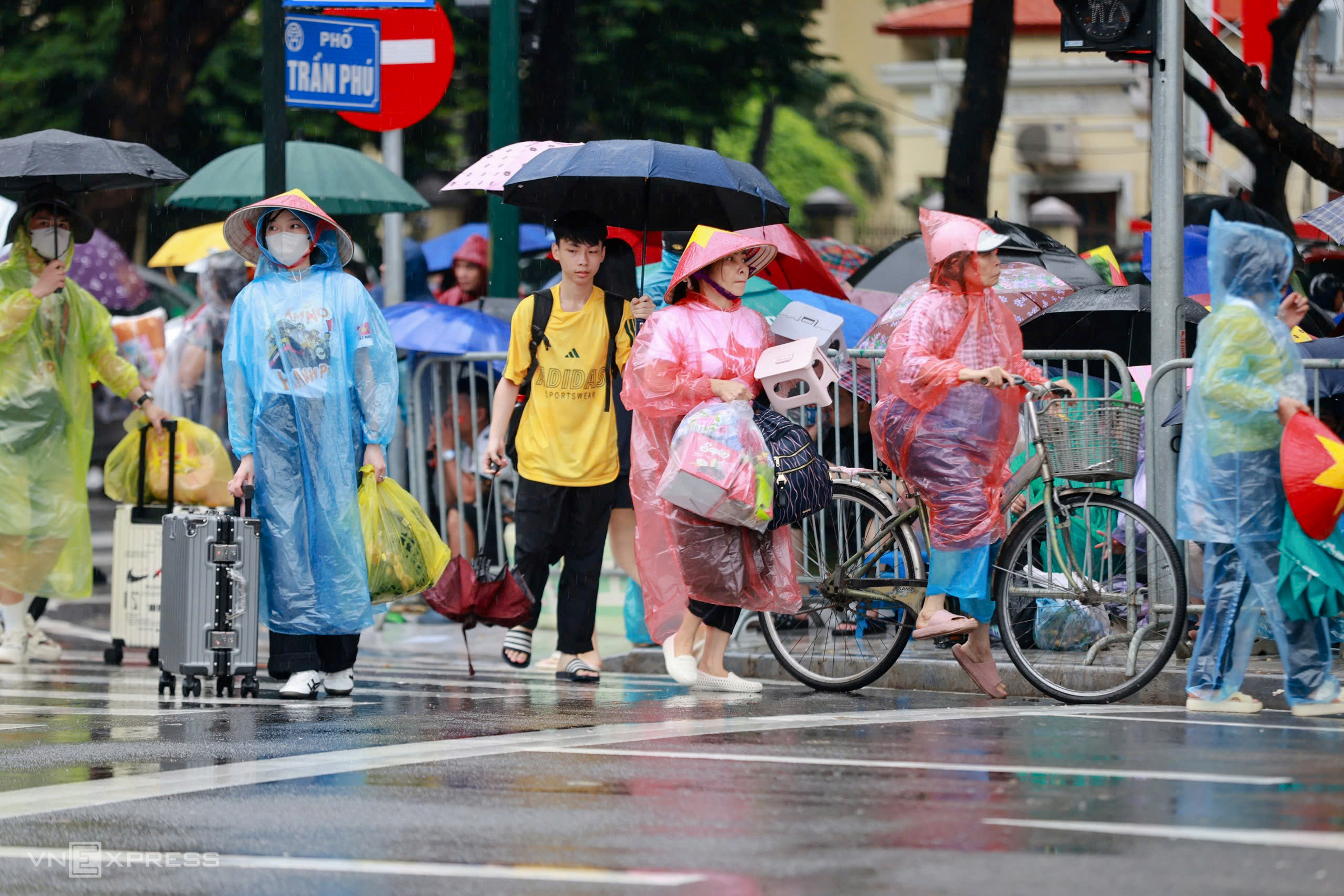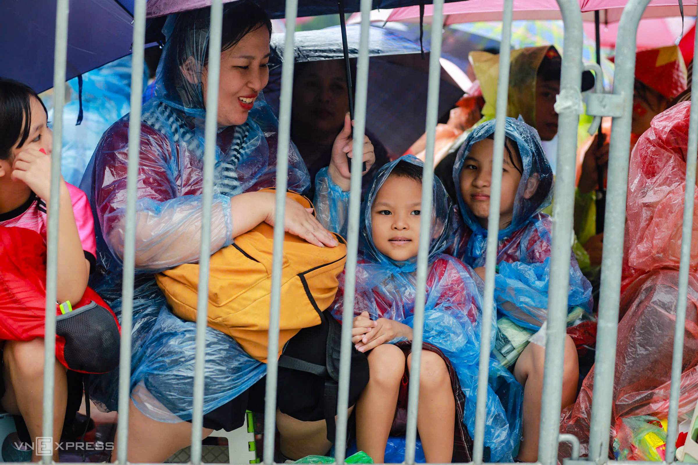 A family in raincoats waits for the parade on Tran Phu street.