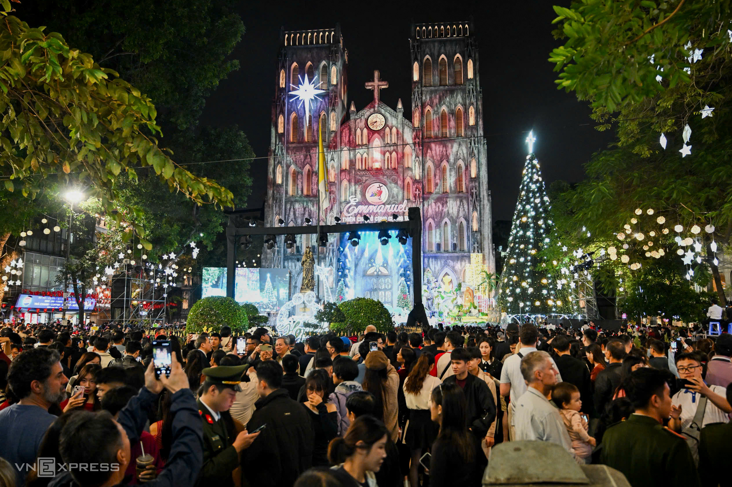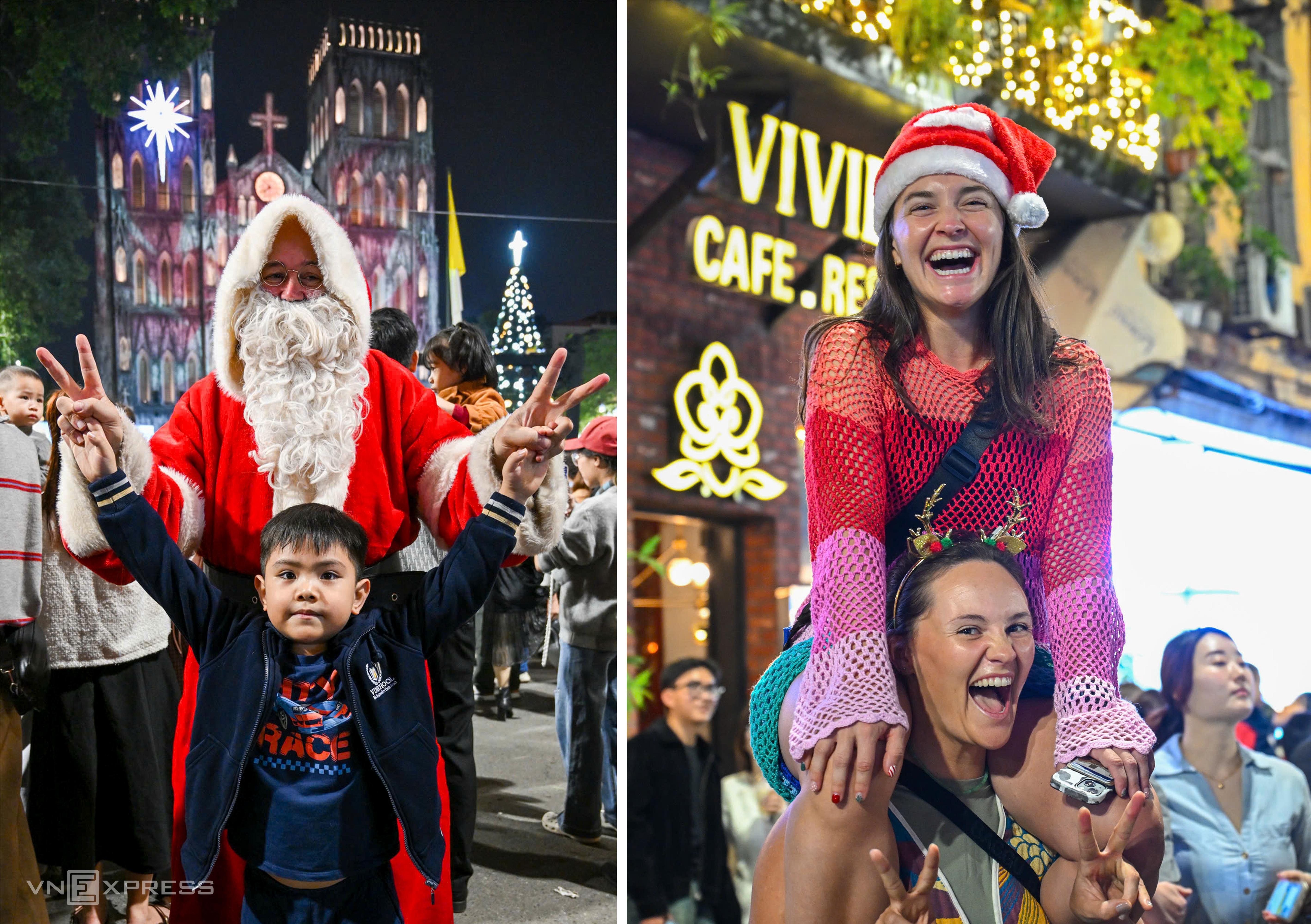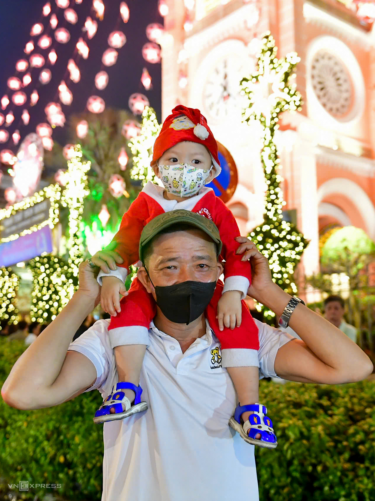 Hoang Quang Minh and Nguyen Thi Kieu Oanh celebrated Christmas Eve together for the first time (left). Nearby, Tran Thu Trang, 31 years old, and her son came to admire Saigon Notre Dame Cathedral lit up for Christmas. She said, "We knew it would be very crowded today, but my son and I still wanted to come to join the peaceful Christmas atmosphere."