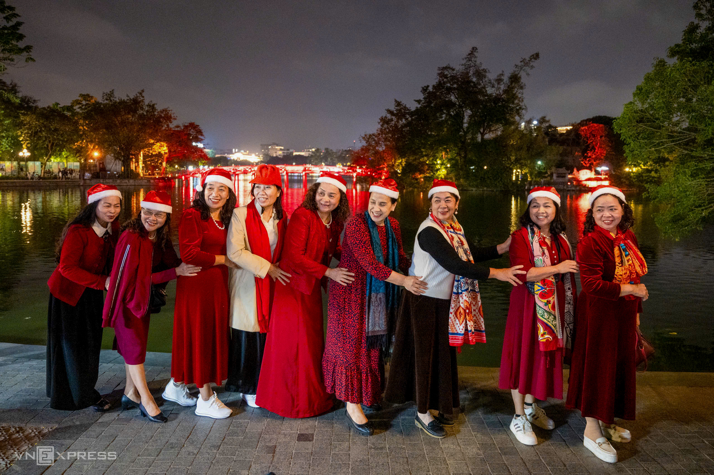 A group of women dressed as Santa Claus took souvenir photos near Ho Guom.