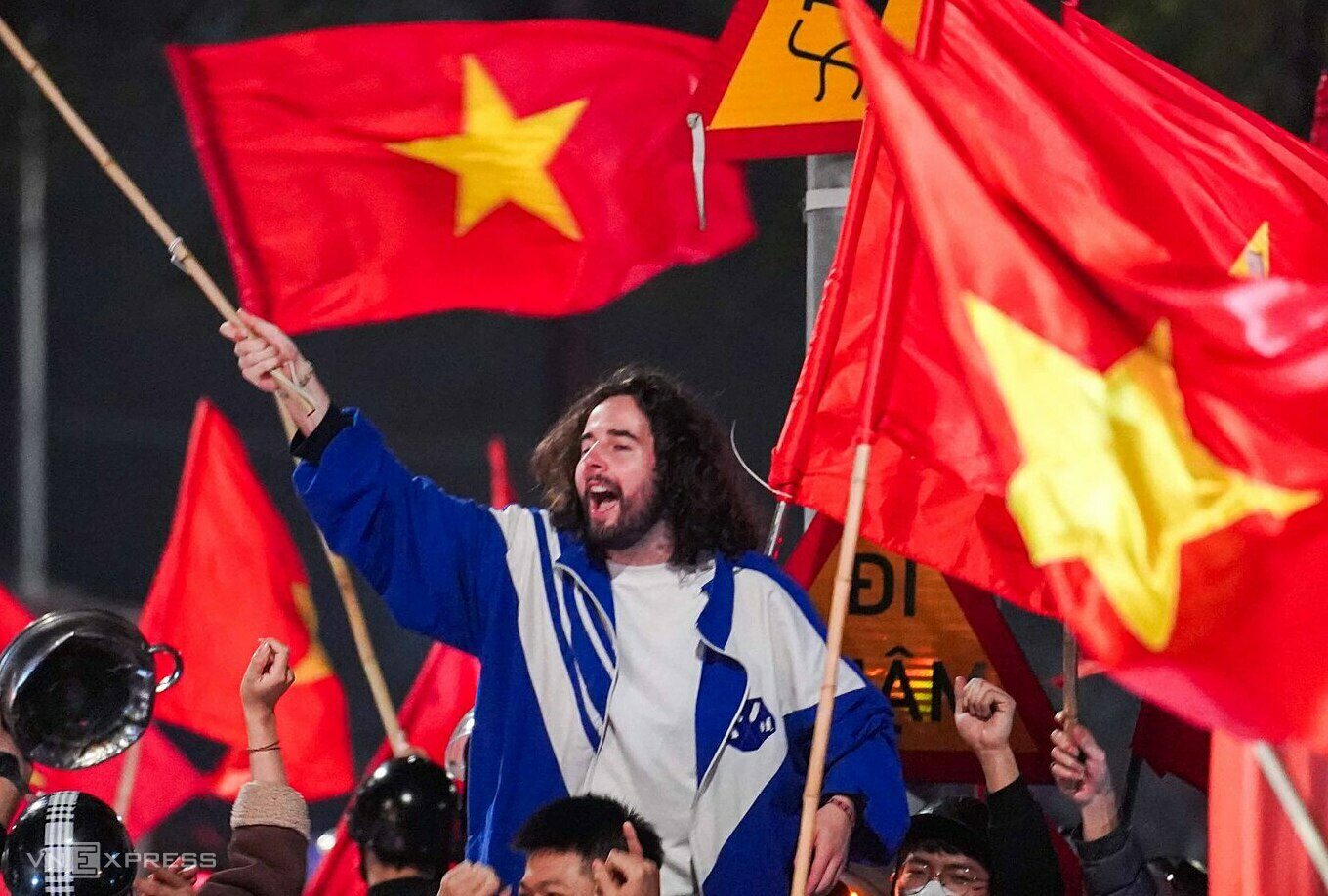 Amidst the celebrating crowds, a foreign tourist, holding a Vietnam flag, enthusiastically joined the residents in their victory celebrations.