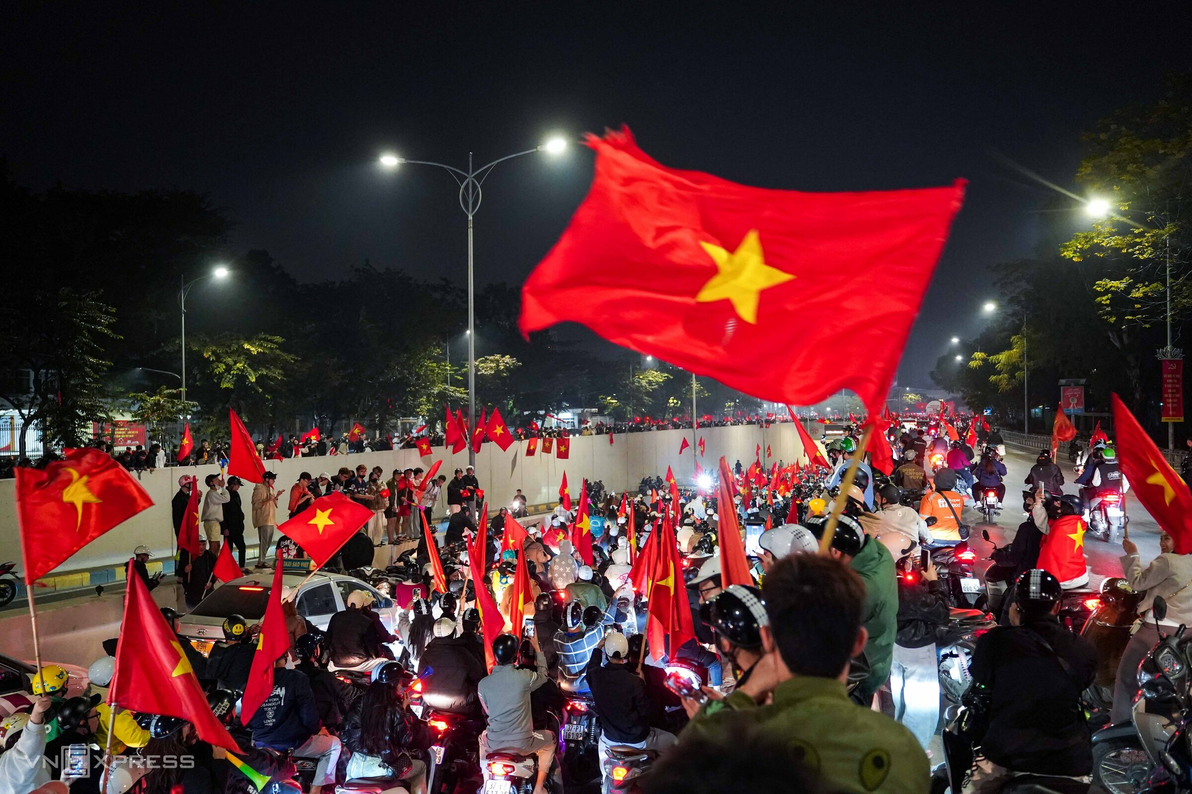 In Hanoi, immediately after the national team's victory at 1h on 17/1, fans from various directions flocked to the capital's center. On streets such as Nguyen Trai and Cau Giay, people carried red-starred flags, cheering and enlivening the celebratory atmosphere throughout the neighborhoods.