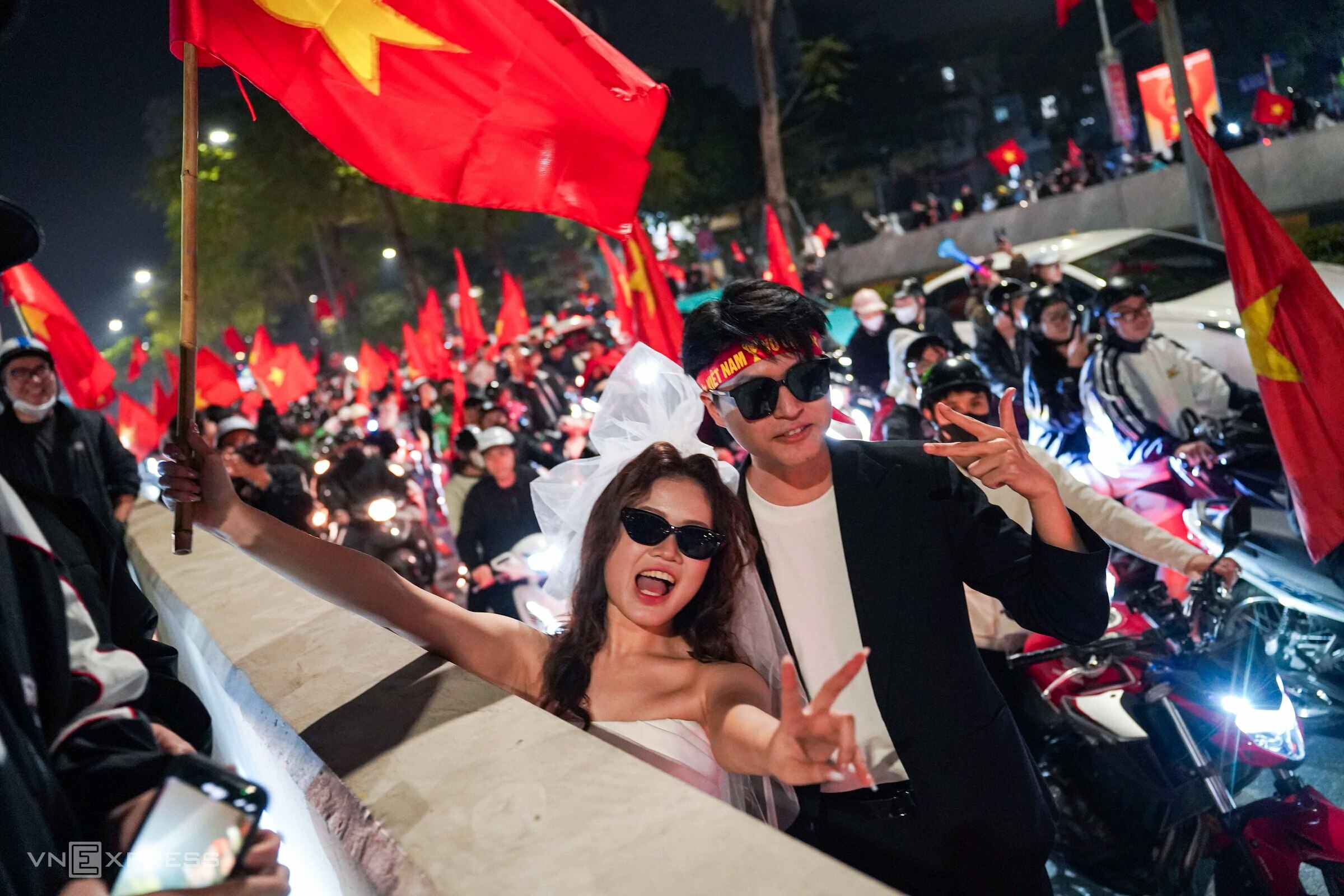 At Kim Lien tunnel, Minh Hieu and Thu Thuy took advantage of the "storming the streets" atmosphere for a special wedding photoshoot. According to the studio, aiming to create meaningful photos that shared in the joy of Vietnam's victory, the team suggested this style to the bride and groom.