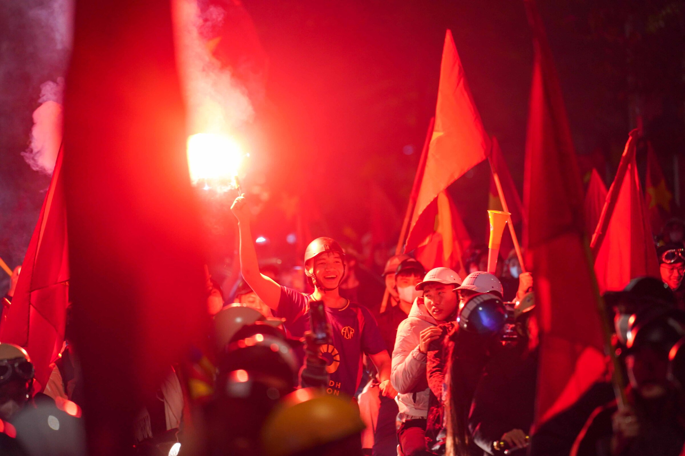 Fireworks and flares lit up the chilly 15 degrees C Hanoi night, blending with shouts of "Vietnam champions".