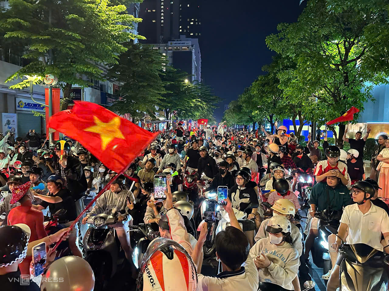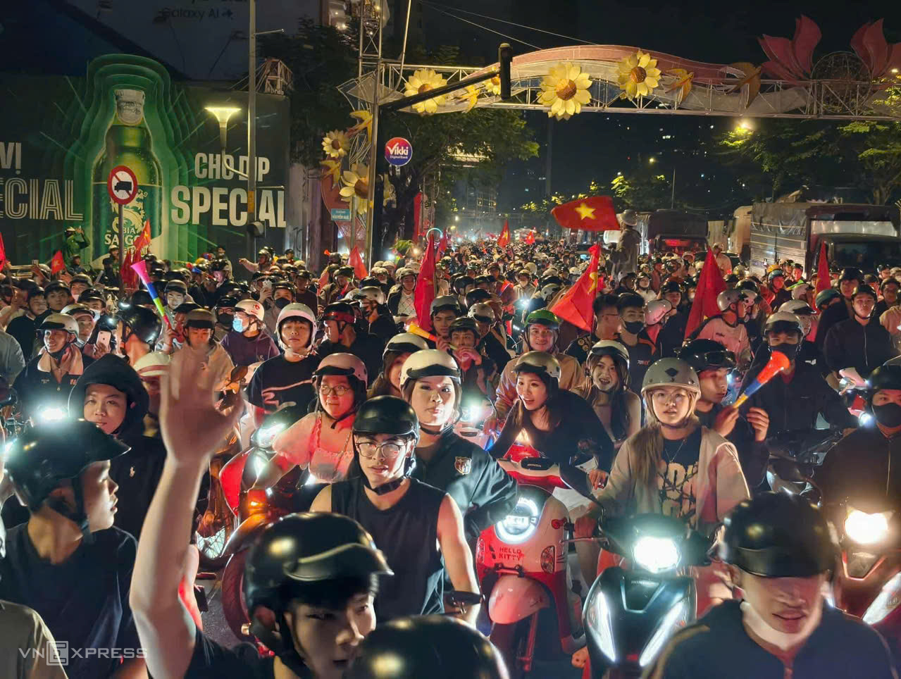 In Ho Chi Minh City, even past 1h, Nguyen Hue walking street was bustling with fans. Supporters carried flags and horns, continuously cheering for the national team's victory.