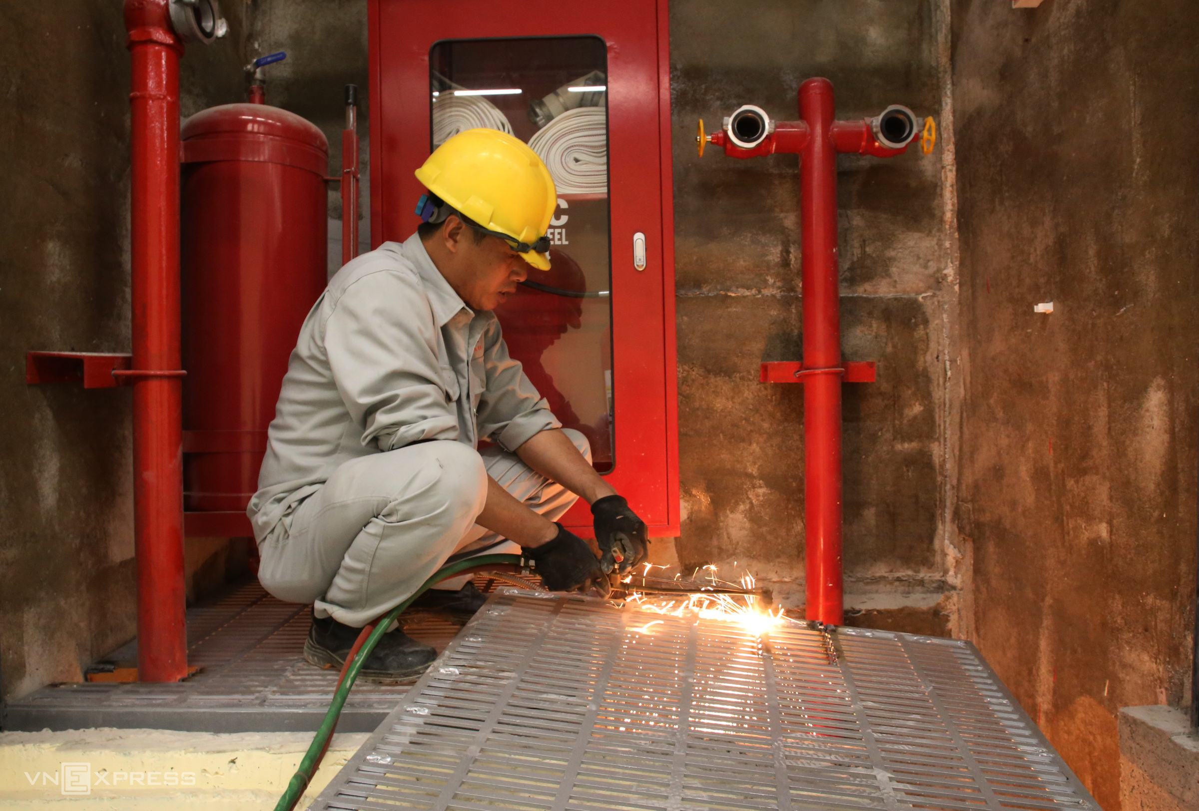 Workers are installing the fire suppression system inside the tunnel, the final component before completion.