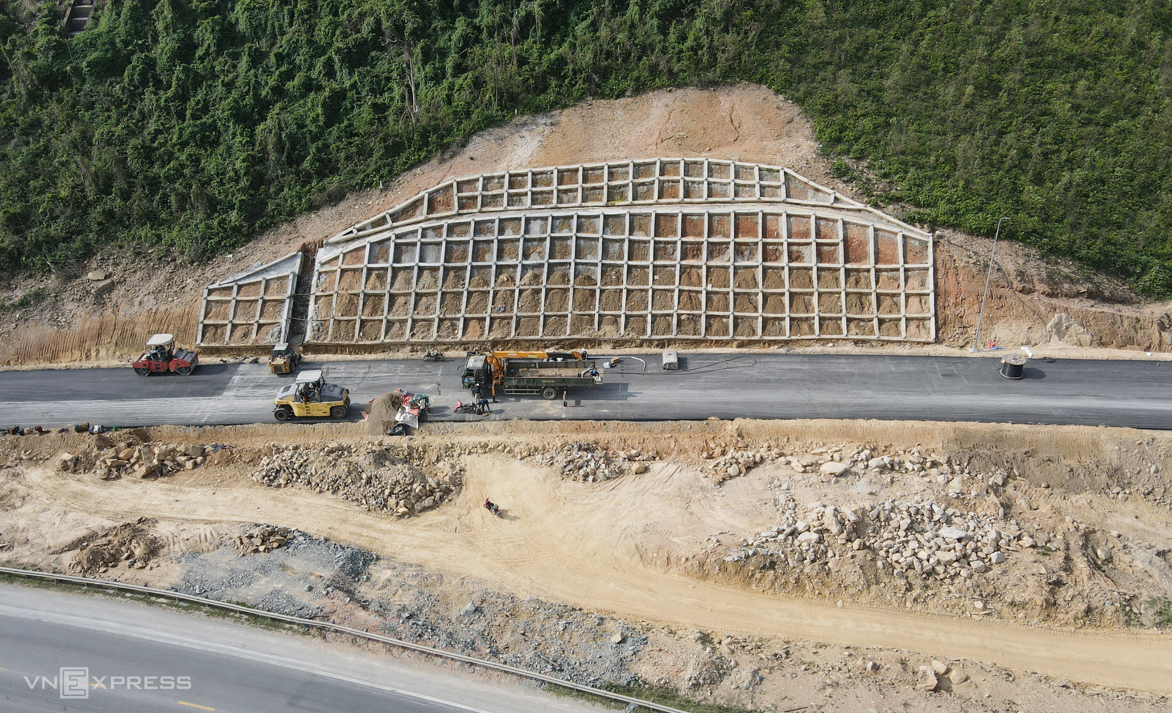 The asphalt pavement is being equipped with signs, guide markings, and guardrails by the construction unit. The access road component was constructed by Long Hung. |