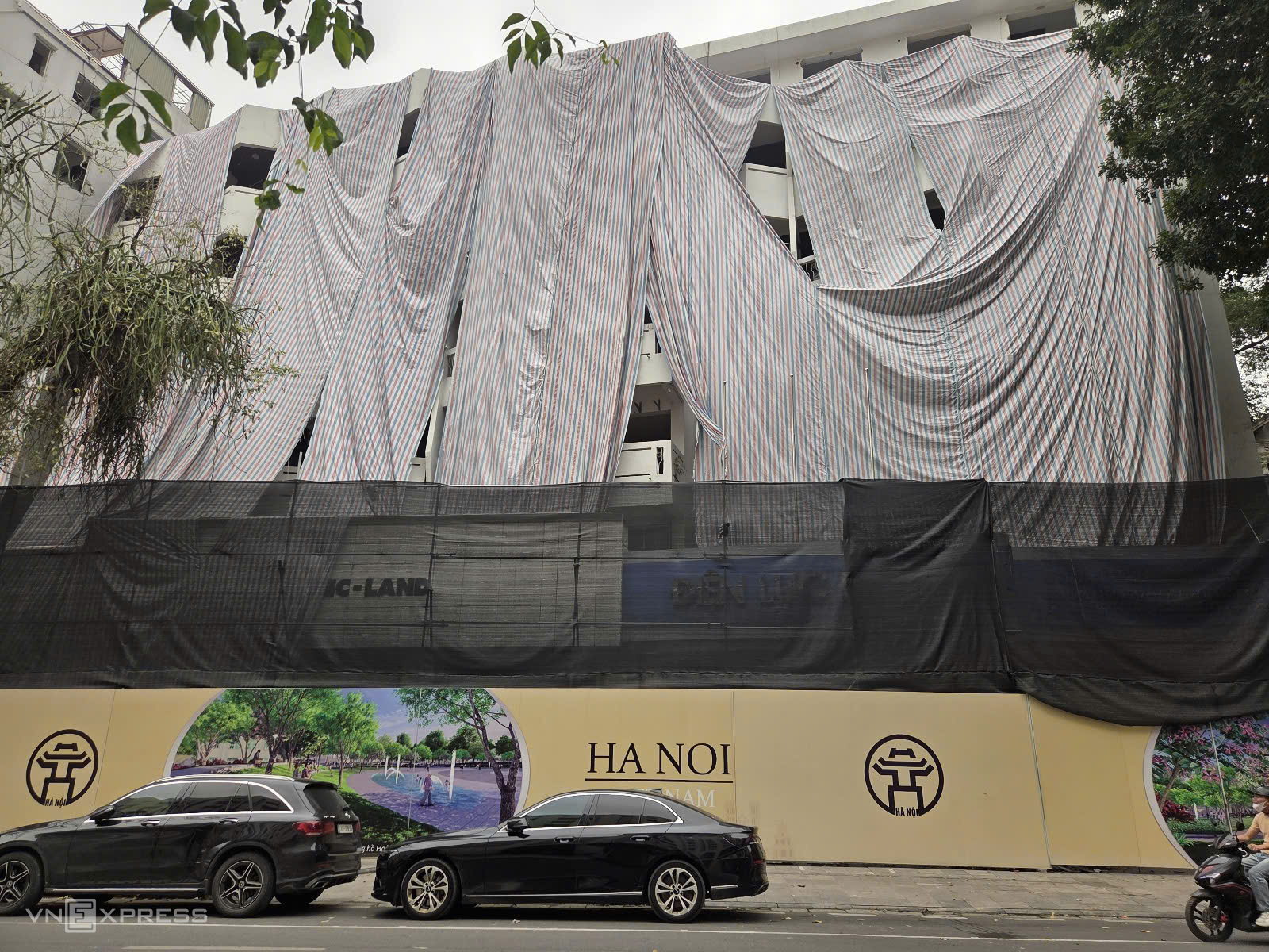 The Dien Luc Hotel on Ly Thai To Street is fenced and covered with tarpaulins, facilitating demolition from within. Photo: Vo Hai |
