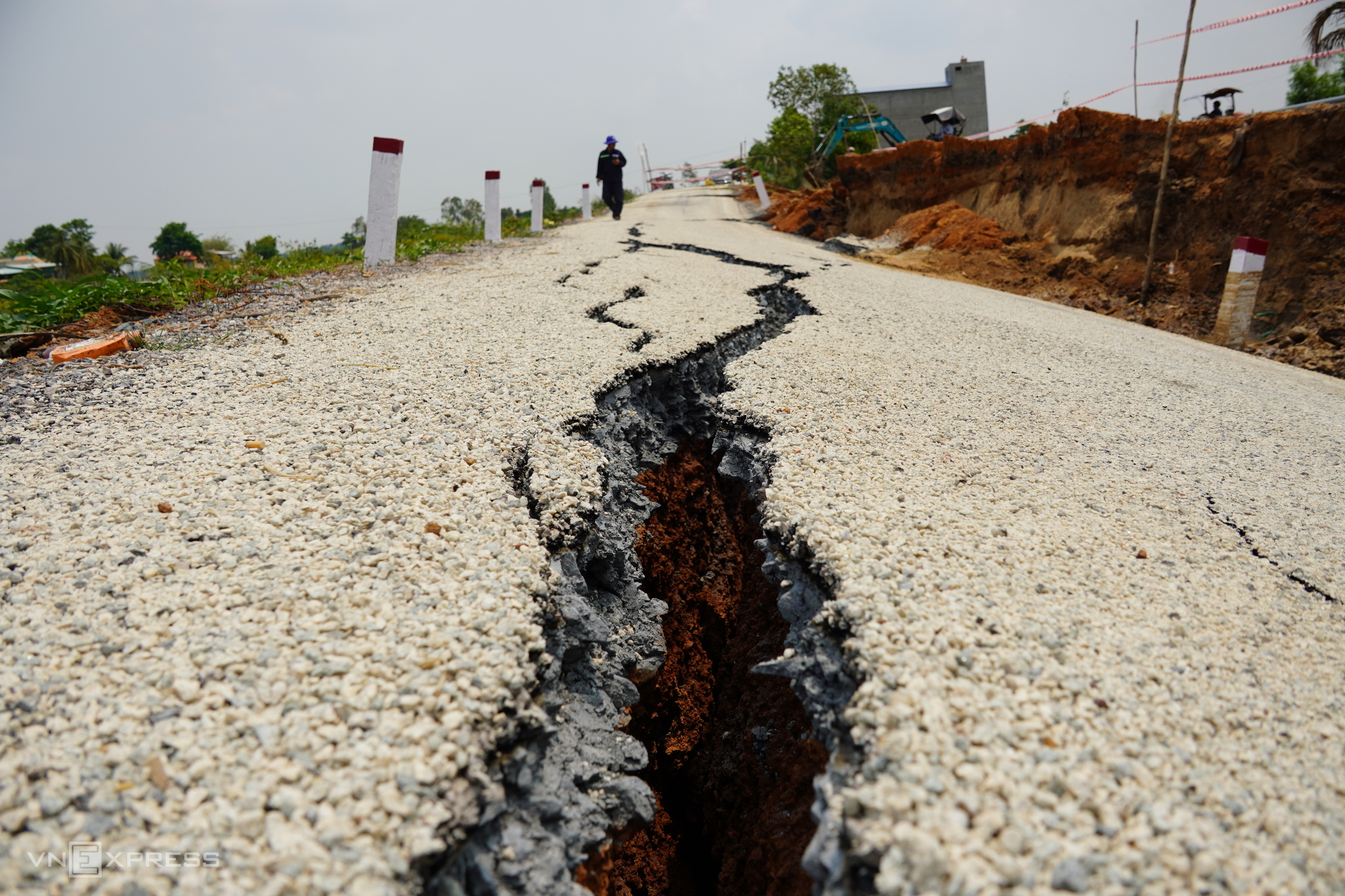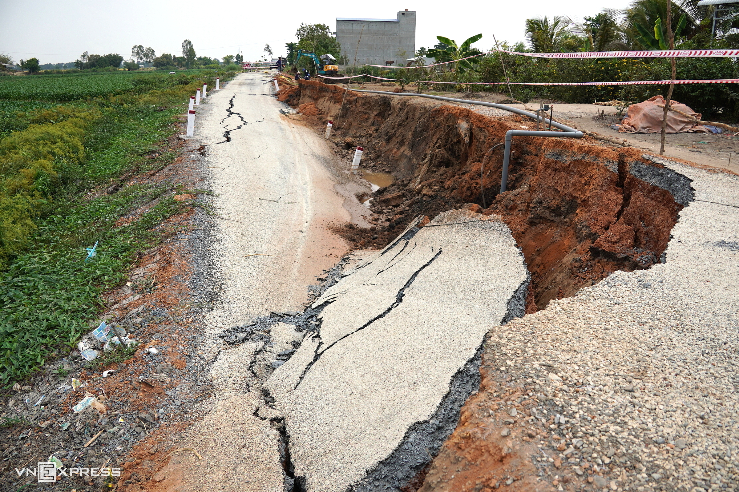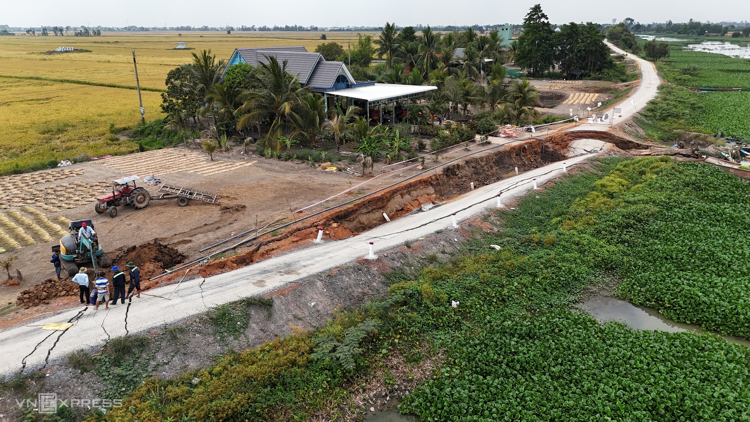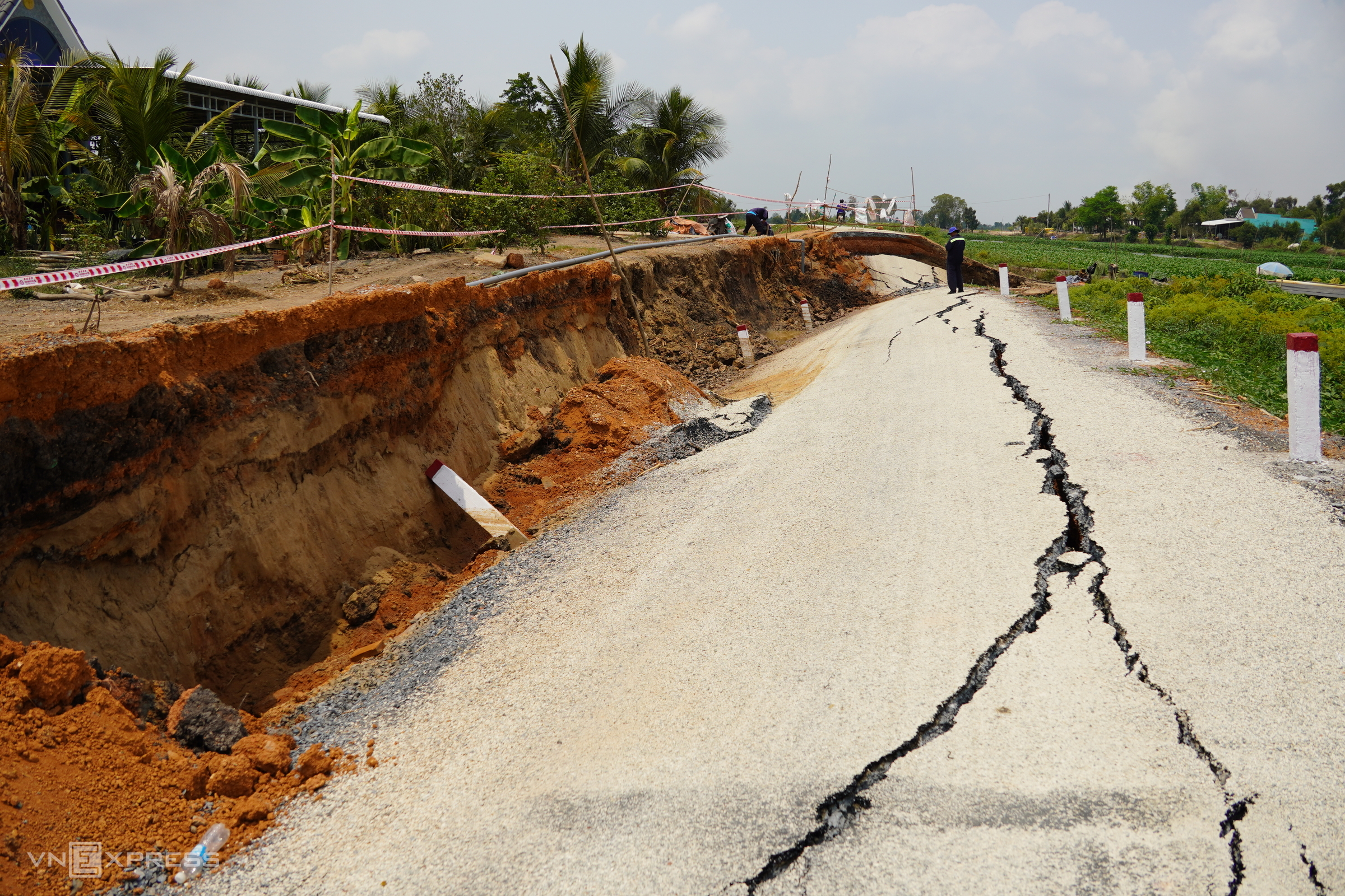 In Ca Mau, the Dong Hung canal road in Cai Nuoc commune also saw multiple landslide spots in mid-April. The longest section, approximately 30 m long, 4,5 m wide, and over one meter deep, cut off traffic. Landslides also occurred in Tran Van Thoi commune, creating deep, multi-meter holes that endanger commuters. Local residents and authorities have filled the holes with soil and used wooden barriers, but many road surfaces remain cracked, posing further landslide risks.