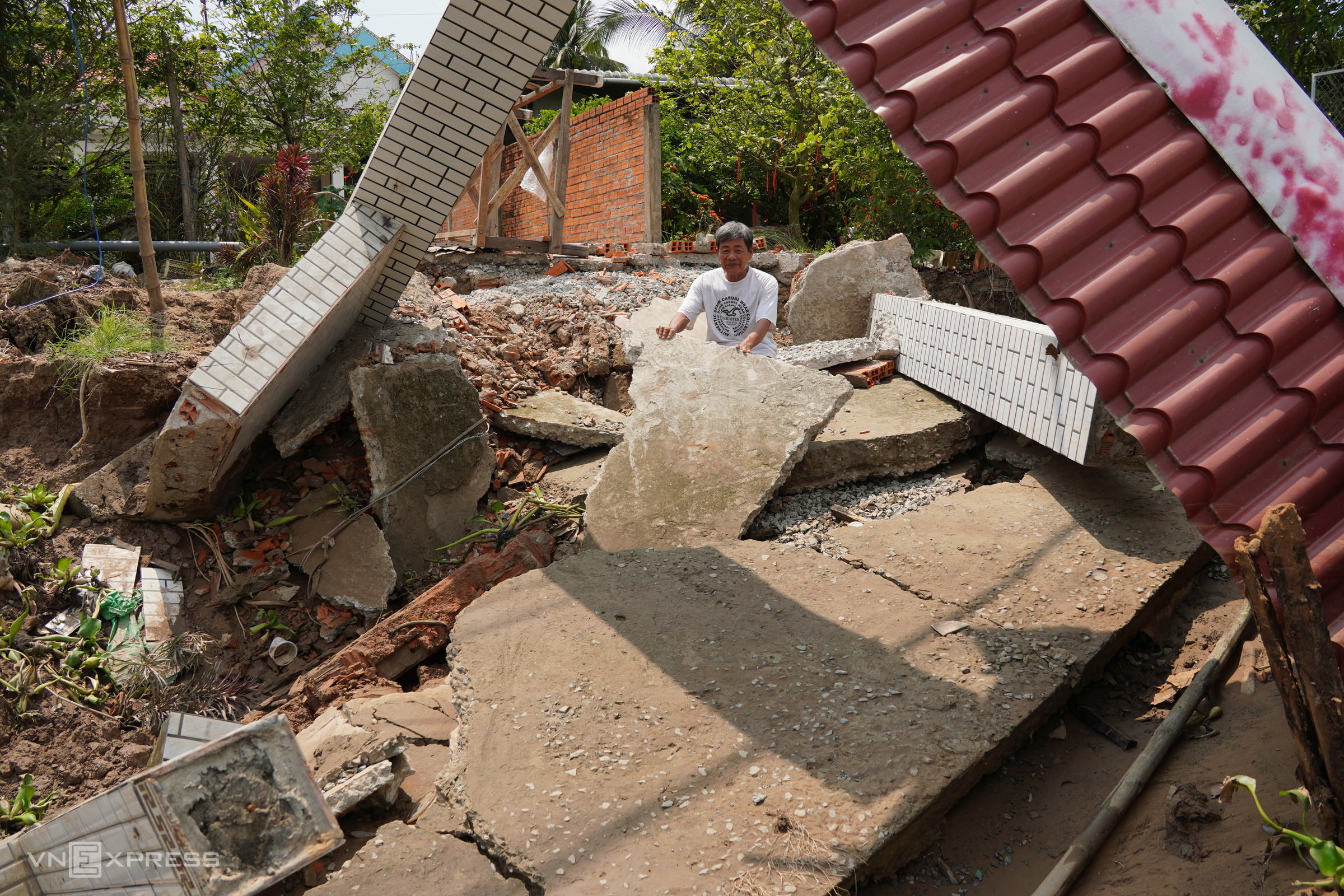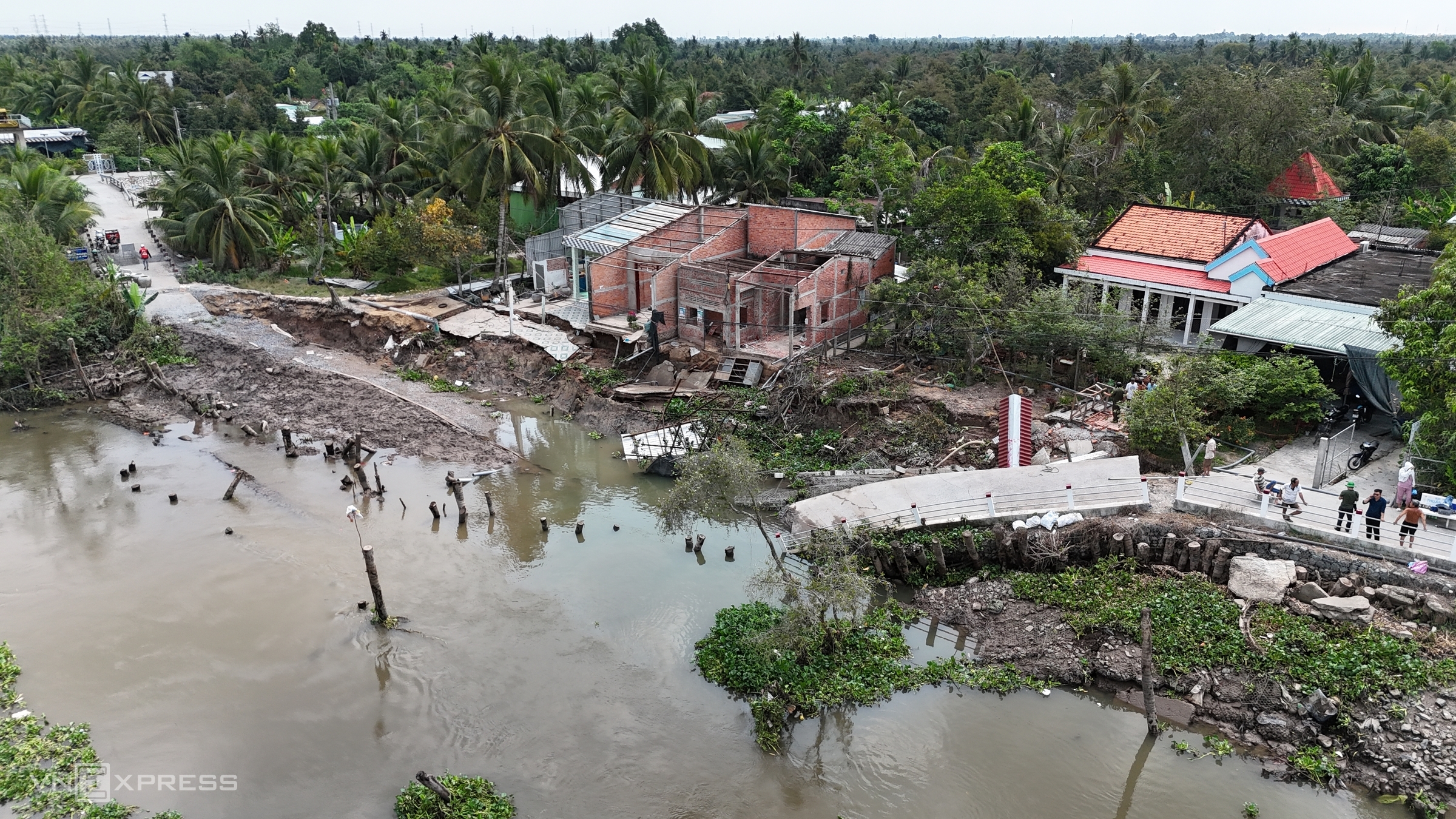 Approximately 90 km away, a section of the Phu An riverside dike-road, over 70 m long, in Hamlet 2, Binh Phu commune, Dong Thap province, also experienced landslides and collapsed into the river.