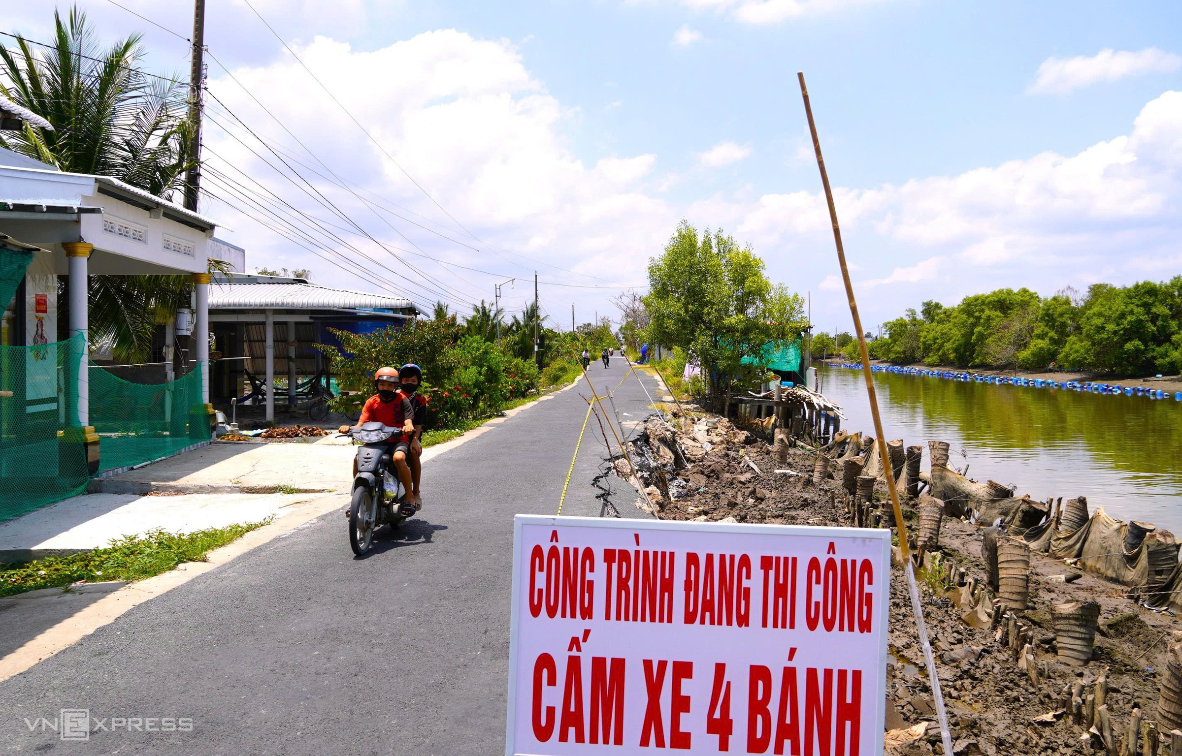 The landslide site along the Dong Hung canal road in Cai Nuoc commune has been reinforced with wooden piles, and authorities have posted signs prohibiting four-wheeled vehicles.