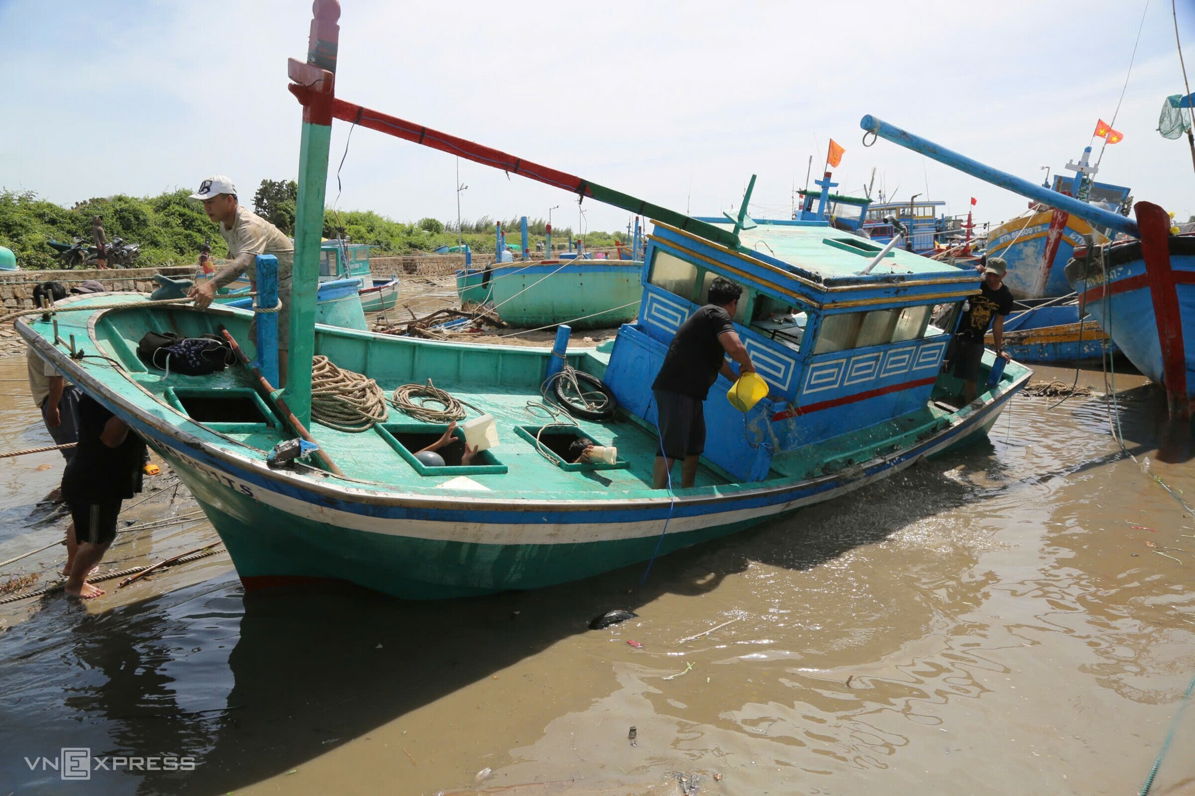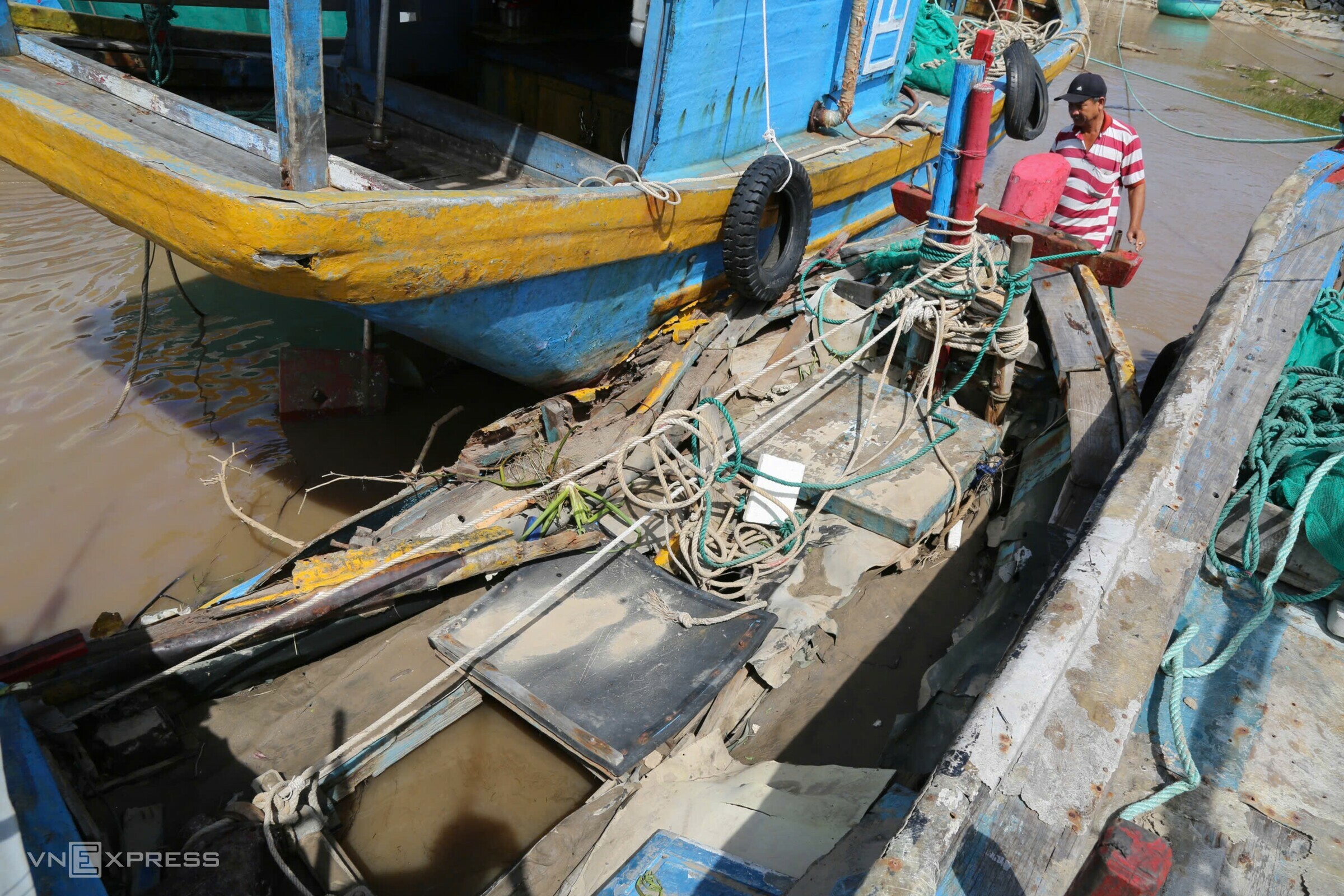 Fishermen clean up and repair fishing boats damaged by collisions on the Phuoc The River. |