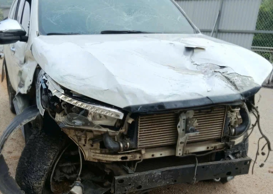 The accident occurred around 7:00 when a man driving a pickup truck on the Noi Bai - Lao Cai expressway, heading towards Noi Bai, crashed into a sheet metal barrier protecting a construction site. The vehicle then veered into the road expansion construction zone near Bao Ha commune, Lao Cai province.