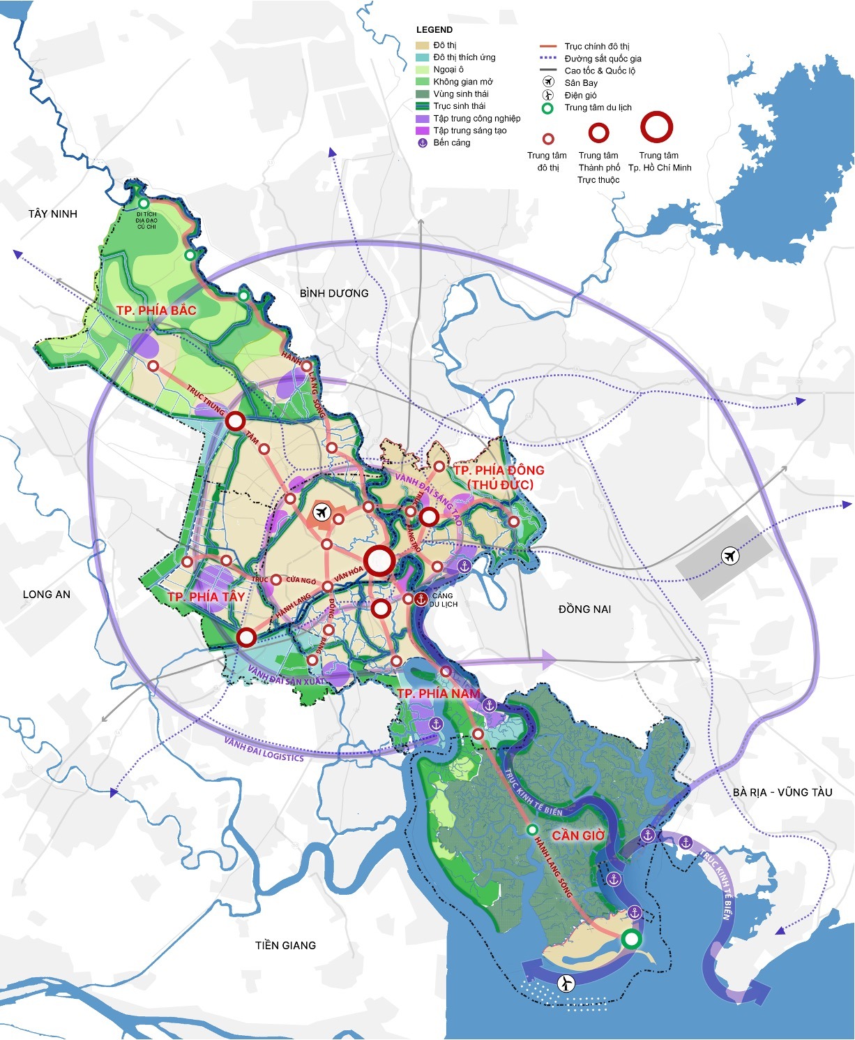 Spatial development plan for Ho Chi Minh City in the draft Master Plan to 2040, with a vision to 2060. This predates the merger with Binh Duong and Ba Ria-Vung Tau. Source: Consulting Group of the National Institute of Urban and Rural Planning (VIUP) - enCity and Ho Chi Minh City Urban Planning Institute (UPI) |