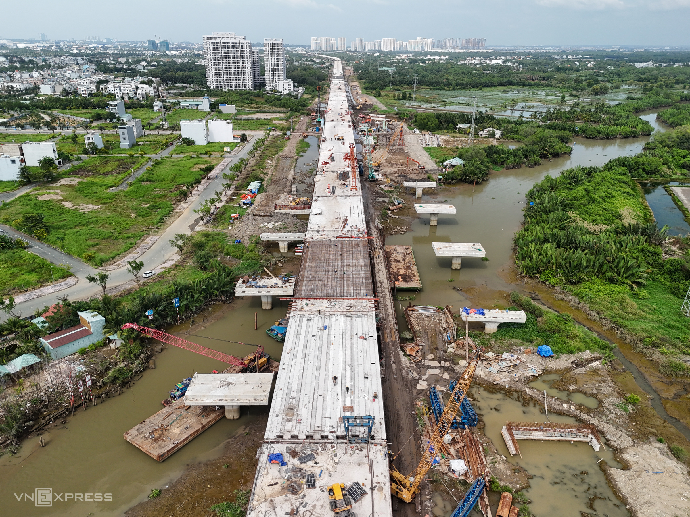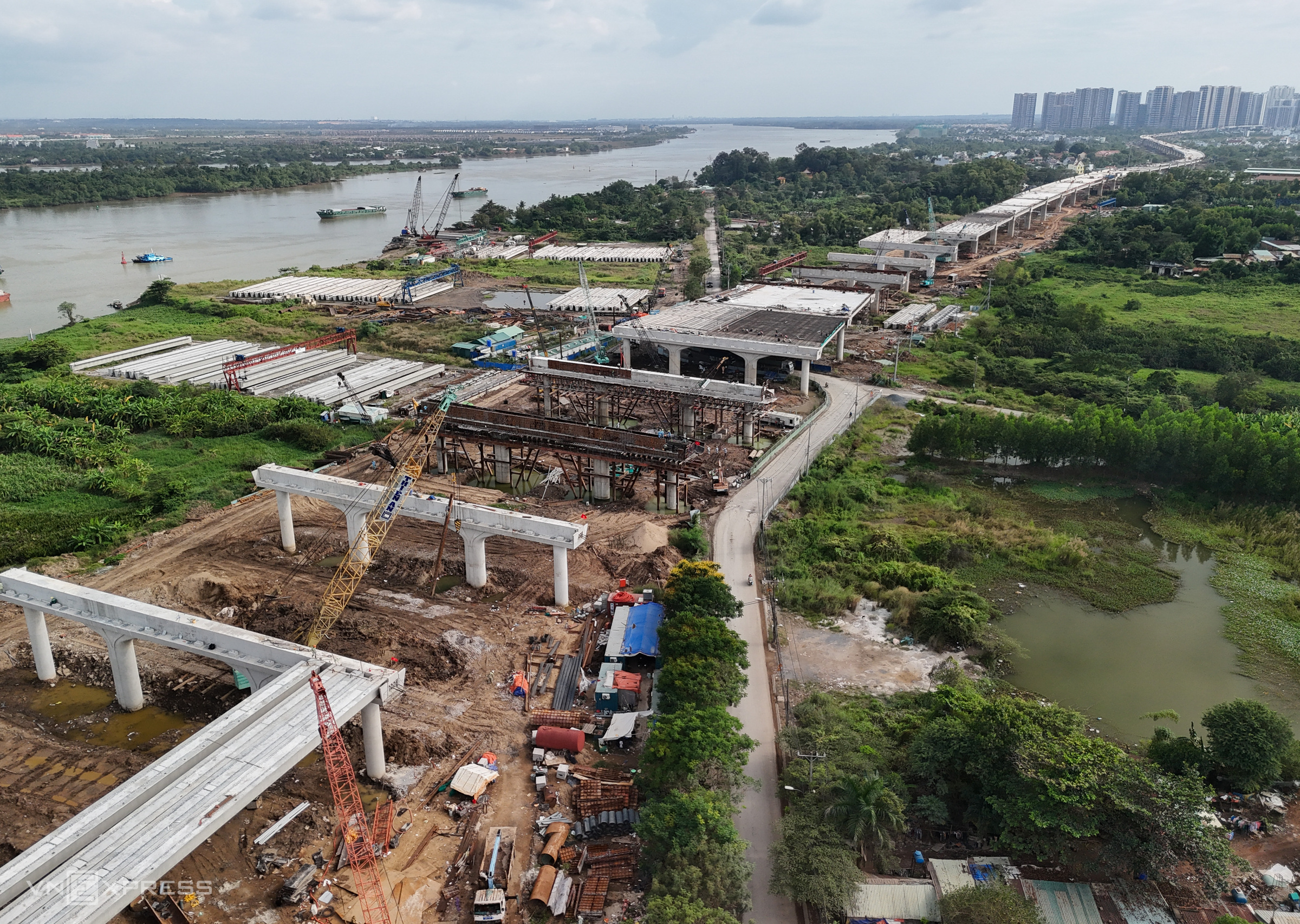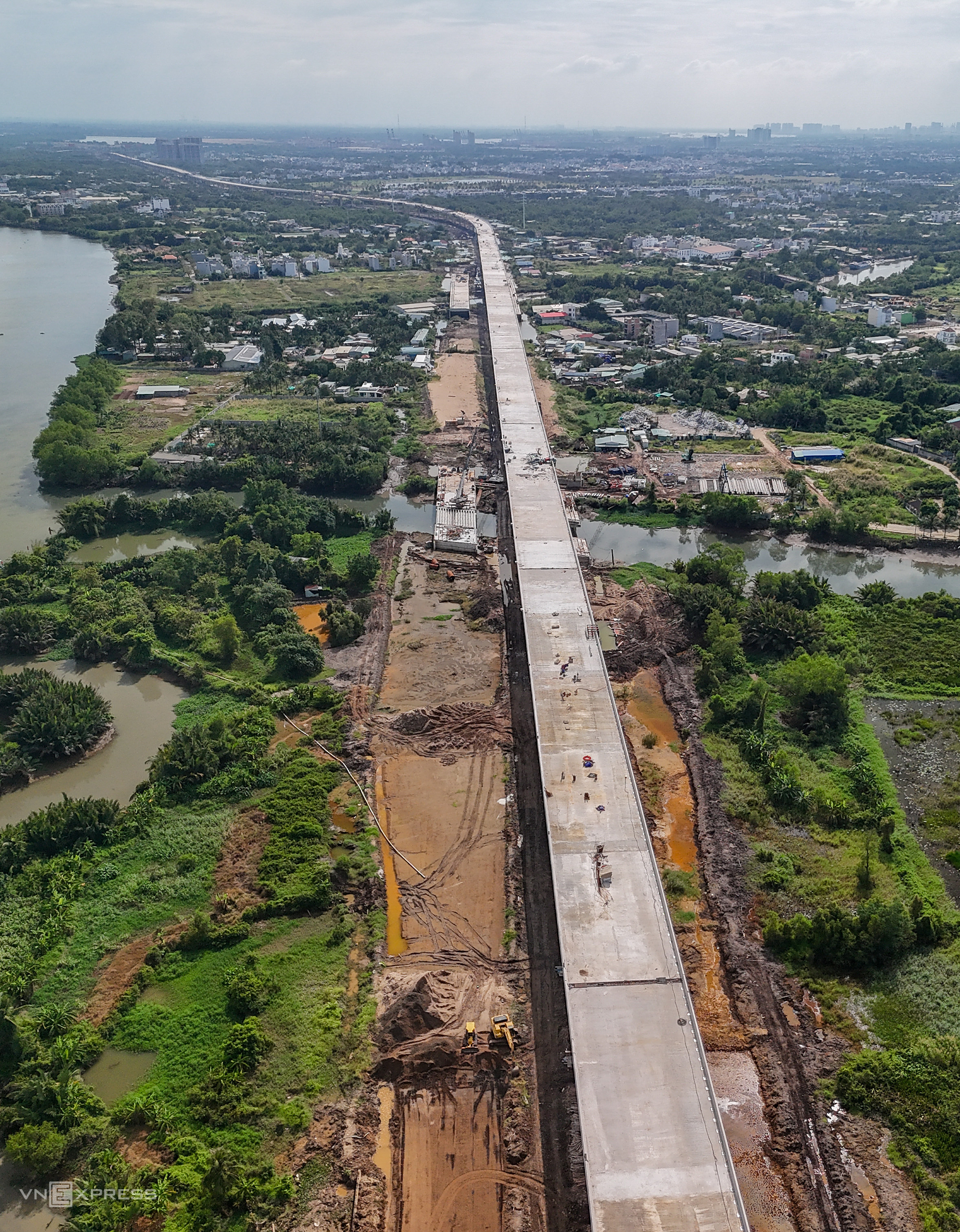 The elevated Ring Road 3 section, curving along the Dong Nai River, is still under construction for its girder and deck slab components.