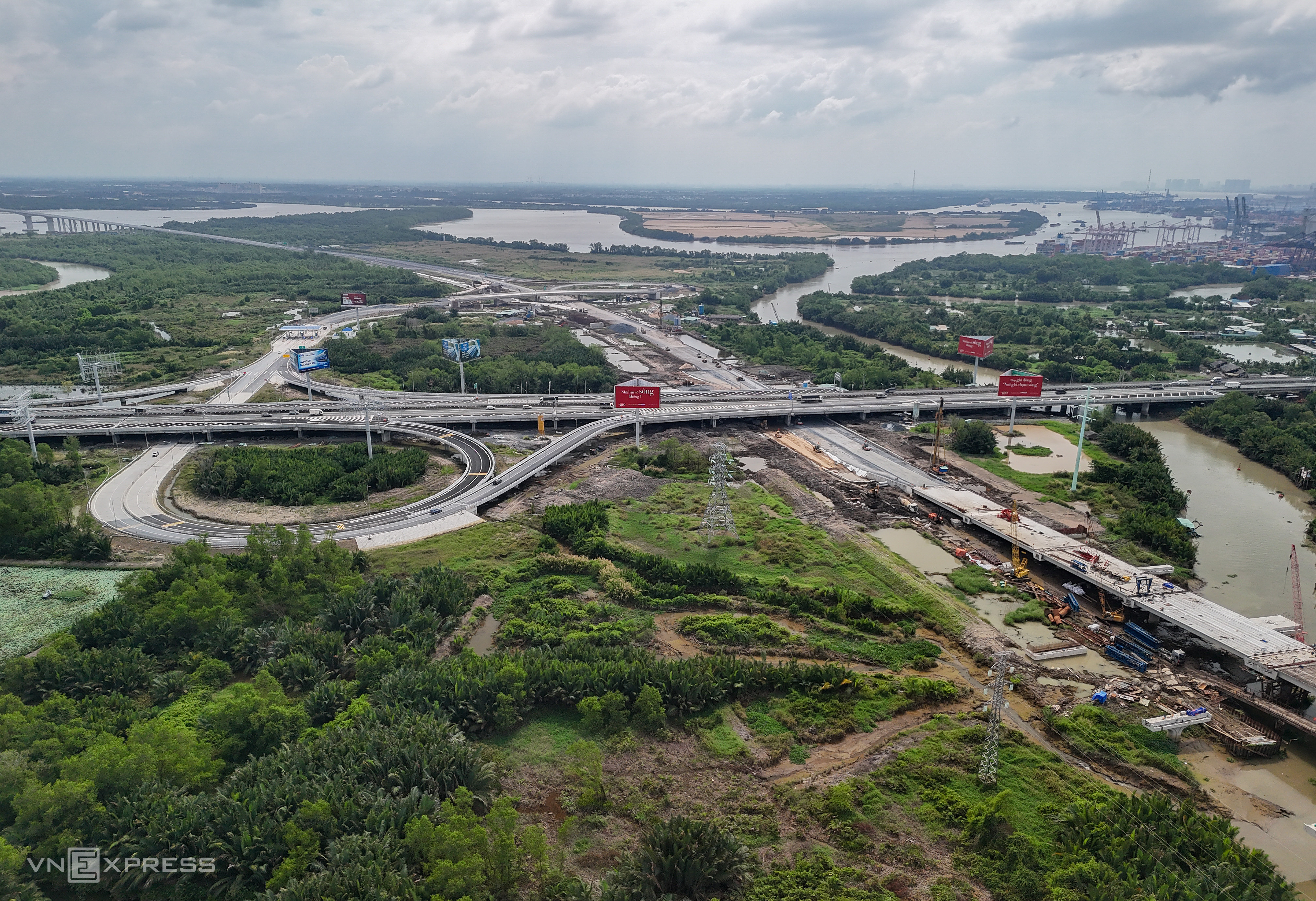 The elevated section of Ring Road 3 concludes at the Ho Chi Minh City - Long Thanh Expressway interchange. Here, bridge spans are seamlessly connected, and connecting ramps to the expressway and Nhon Trach bridge are under construction.