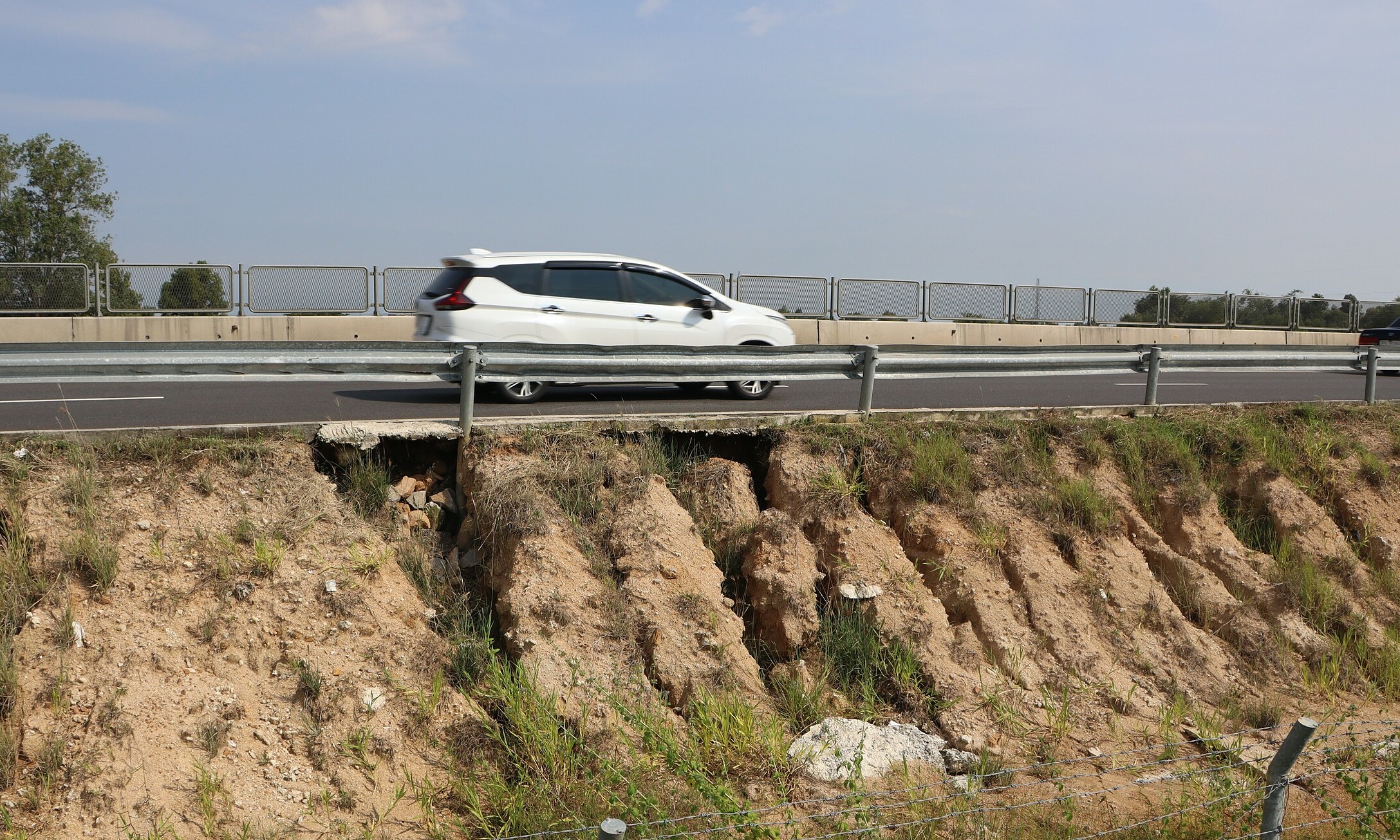Damaged roadside embankment on the expressway in Ham Liem commune, 9/9. Photo: Viet Quoc |