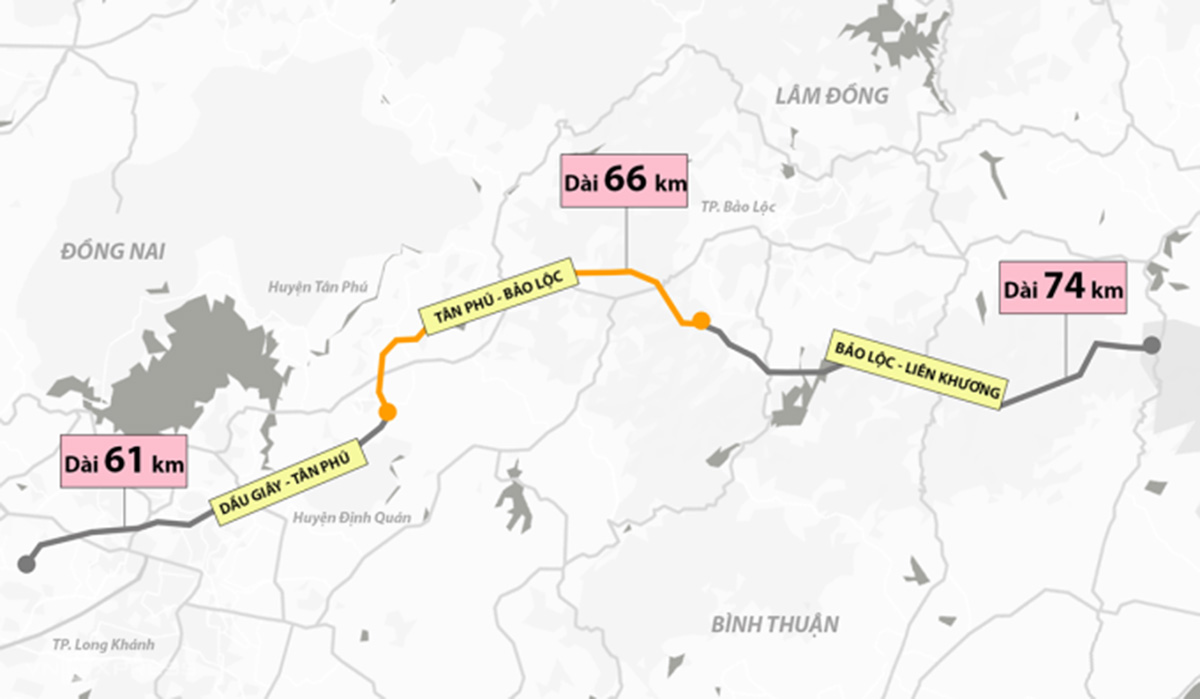 The expressway's starting point connects with the end of the Dau Giay - Tan Phu expressway. Its terminal point is in Bao Loc City, Lam Dong province, linking to the 74 km Bao Loc - Lien Khuong expressway, which commenced construction in late June.