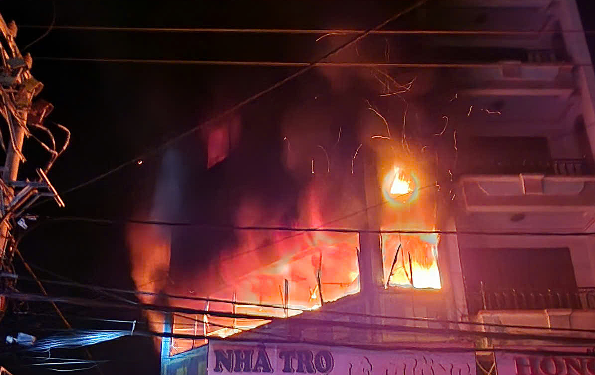 Around 4:30 AM, a fierce fire erupted on the second floor of a house exceeding 100 m2 at the Nguyen Thai Hoc - Nguyen Hong Son intersection. The building served as both a rental property and a business establishment. Three individuals were inside the rented accommodation when the fire started.