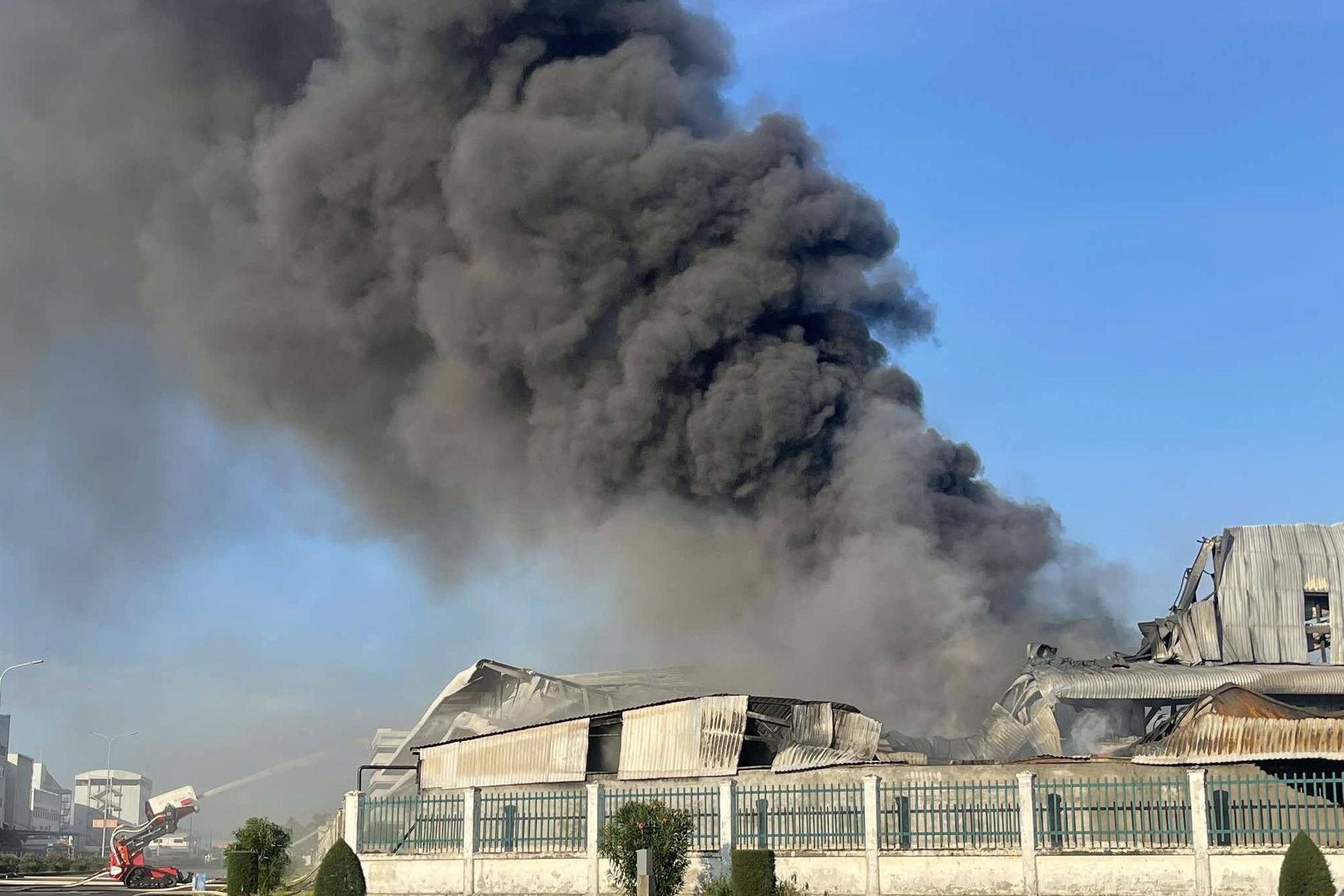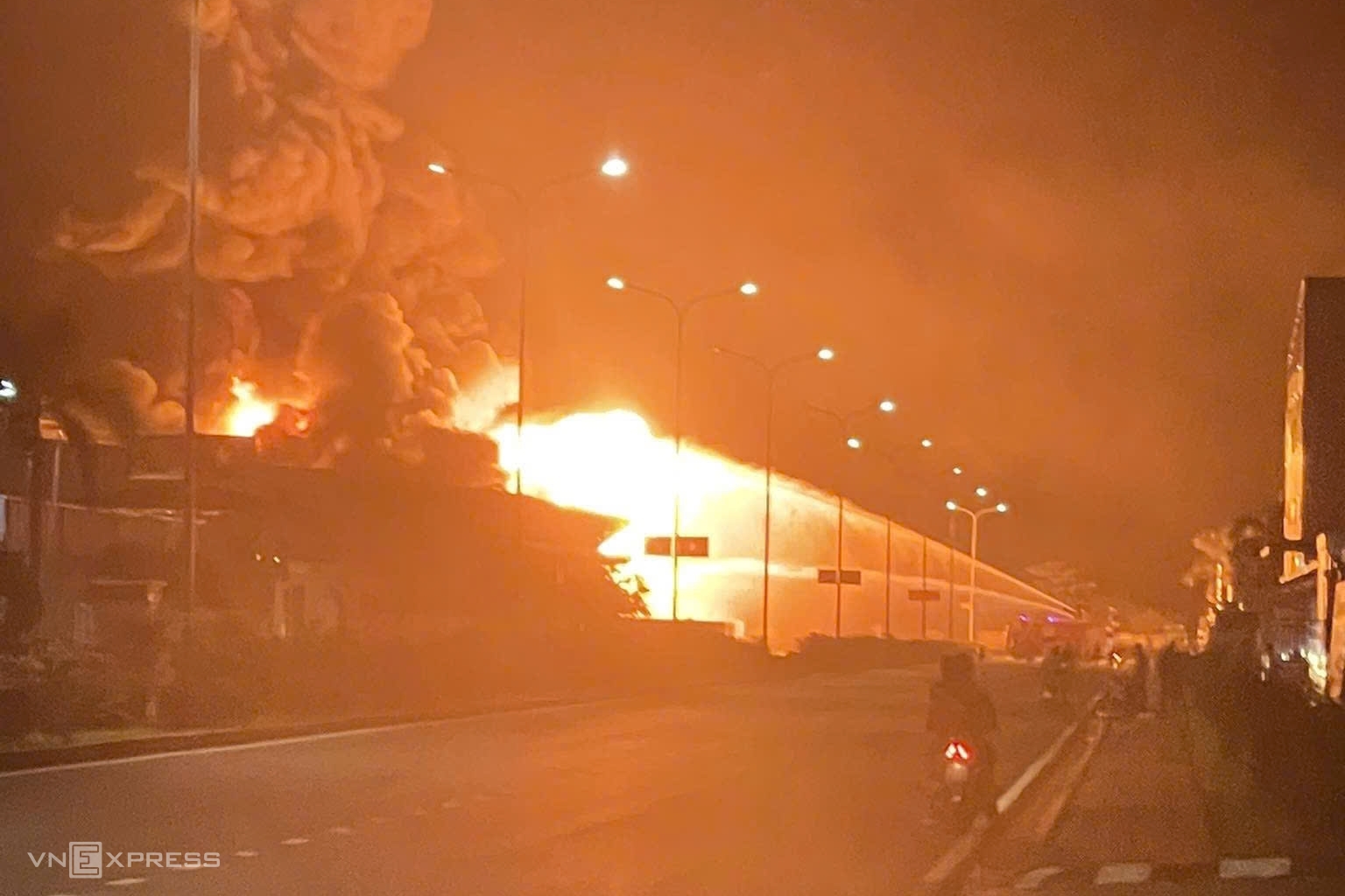 Around 1:30 a.m., a fire erupted in the 200-square-meter finished goods warehouse of Cheng - V Vietnam Co., a leather shoe manufacturer, located adjacent to the industrial zone's internal road. Due to the abundance of flammable materials, the fire quickly engulfed the entire workshop, sending a plume of black smoke dozens of meters high.