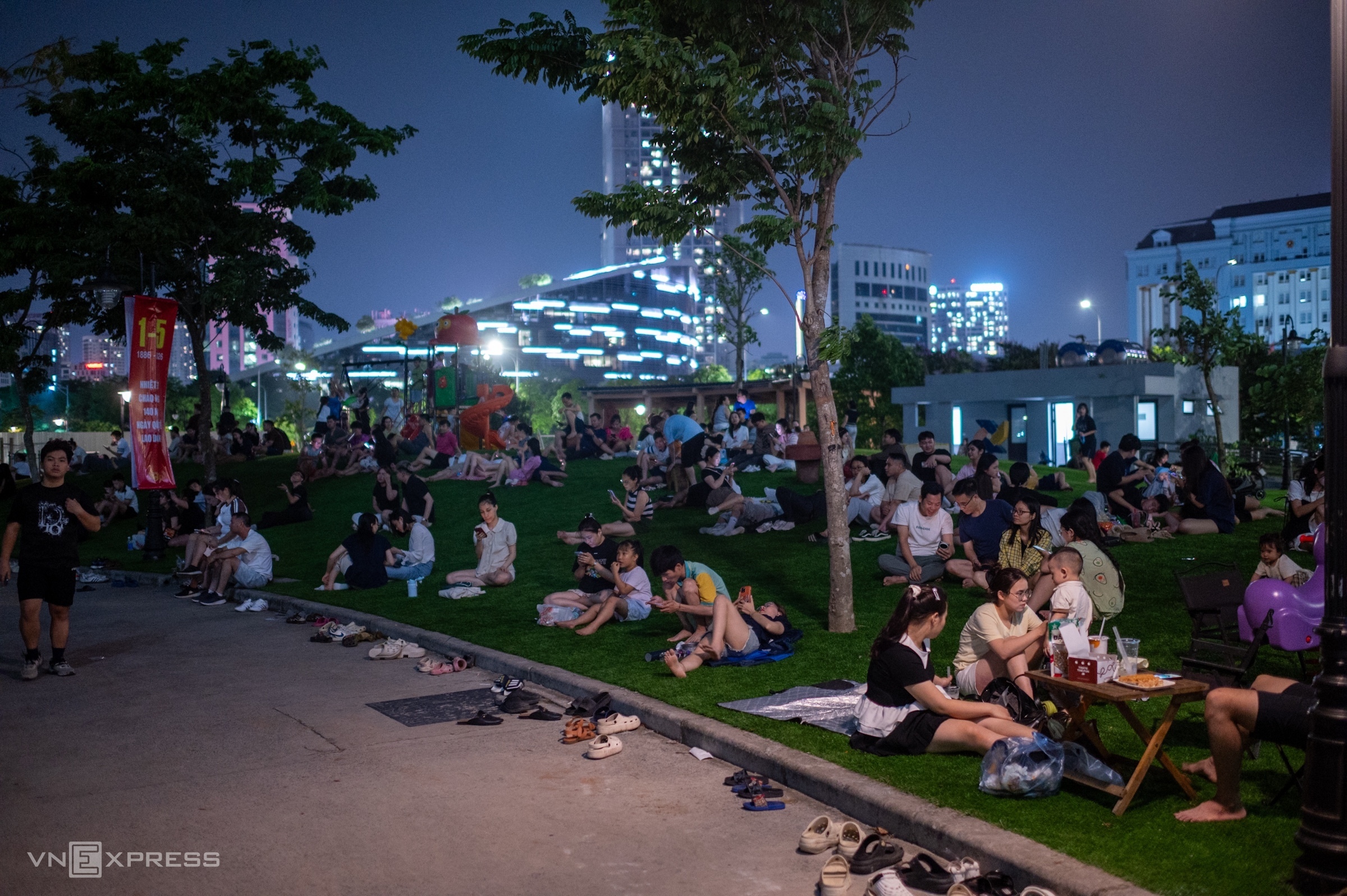 At CV1 conditioning park (next to Hanoi Children's Palace), hundreds of residents arrived early. Many families brought tables, chairs, and food, waiting together to enjoy the show.