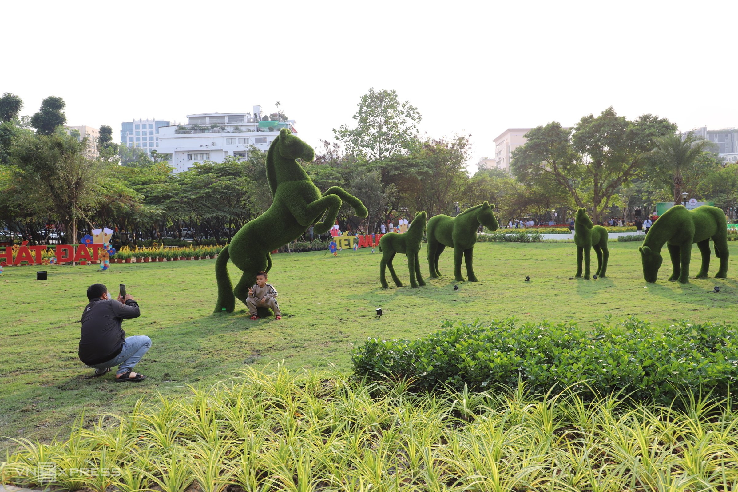 Residents taking photos next to the horse mascot at the park, on the afternoon of 25/1. Photo: Le Tuyet |