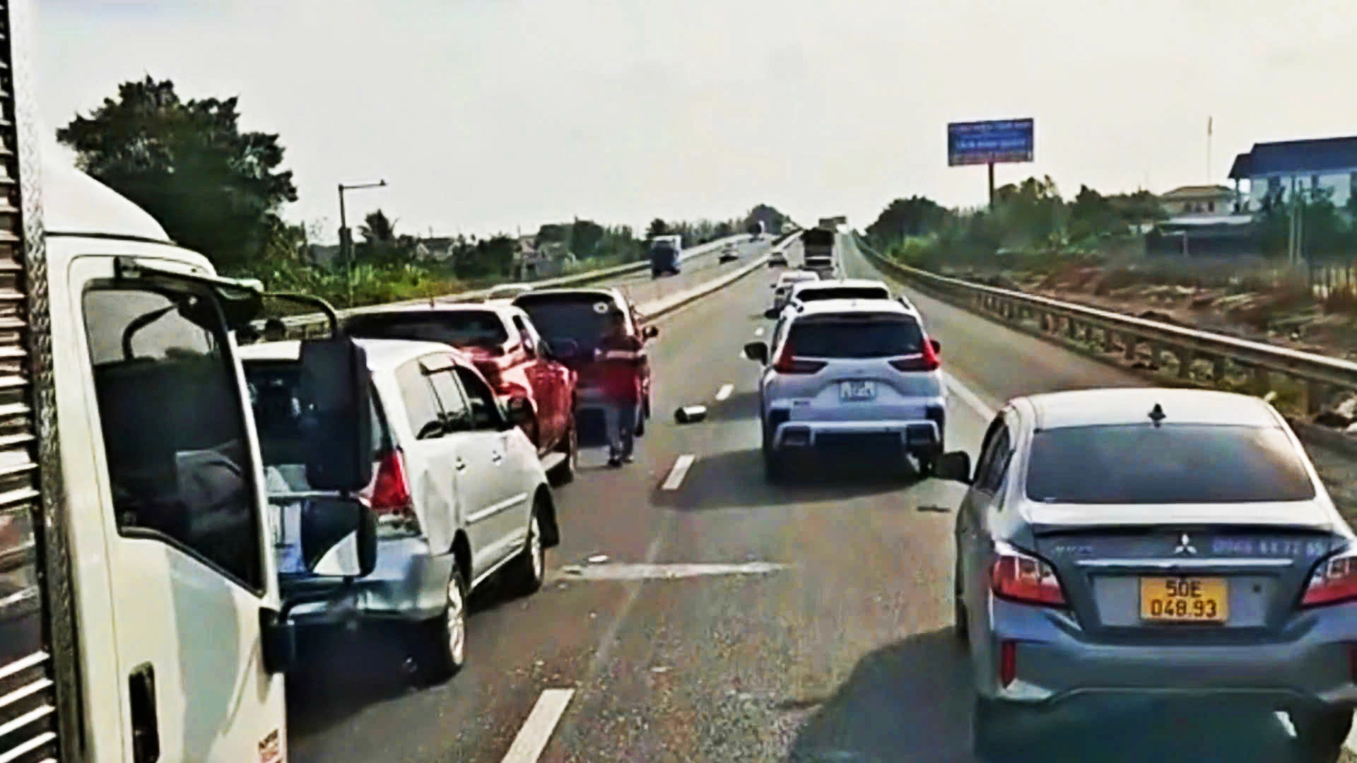 5 damaged vehicles in lane one caused kilometers-long congestion on the expressway. Photo: Nam An