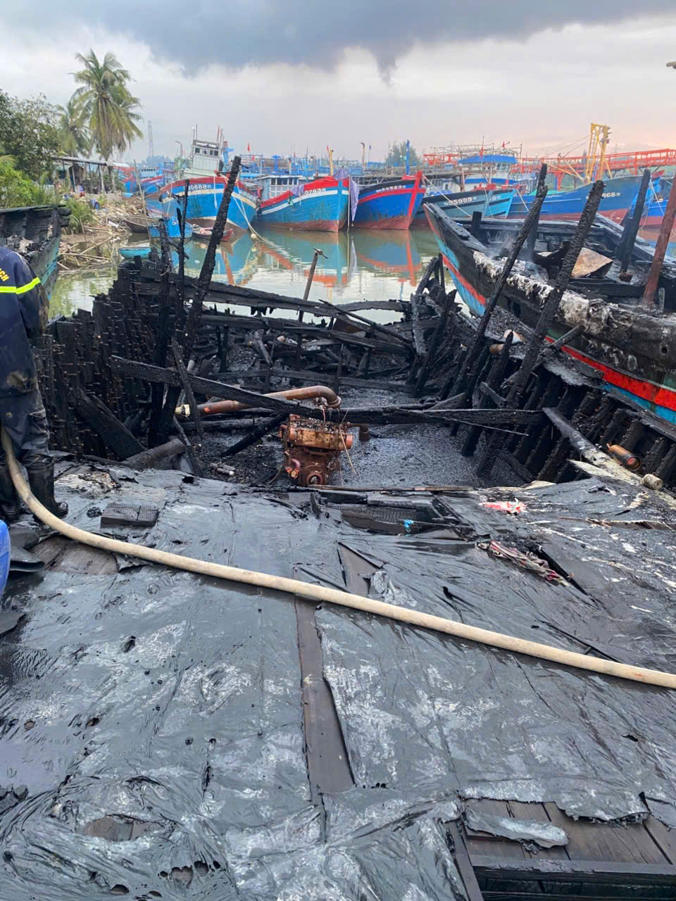Police focused on containing the fire to prevent its spread to dozens of nearby vessels. After approximately 5 hours, the fire was brought under control. Four fishing boats, each 18 to 20 meters long, belonging to fishermen from Binh Son and Van Tuong communes, sustained damage ranging from 20% to nearly total destruction. The cause of the incident is currently under investigation.