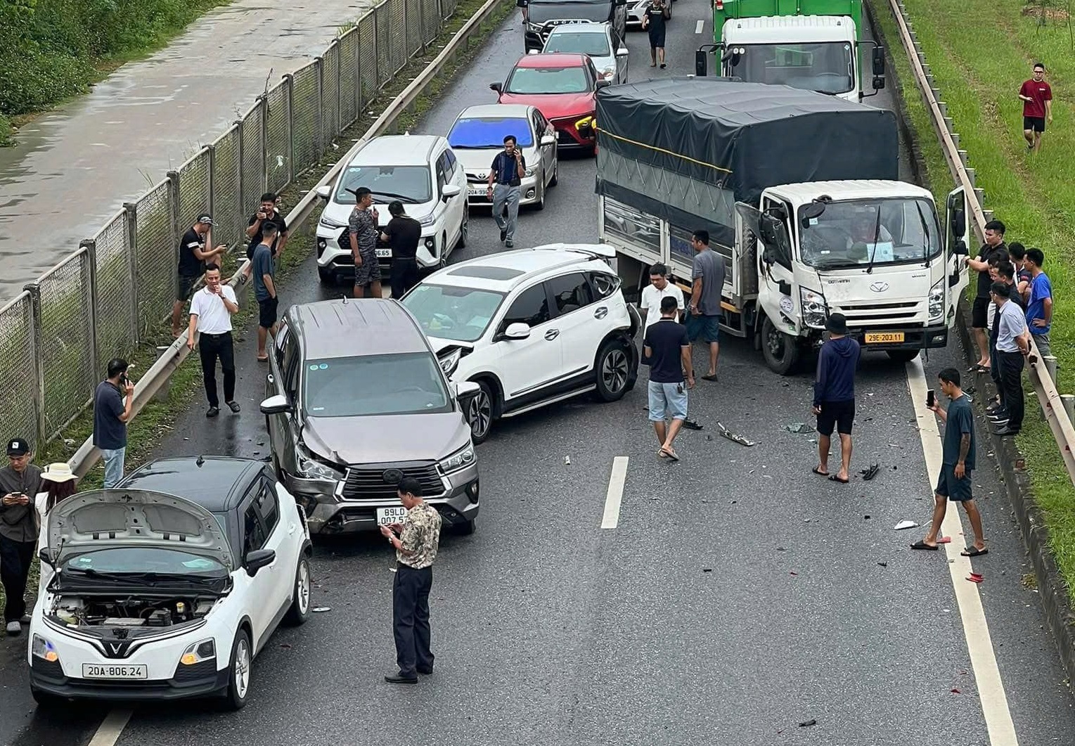Around 12:45 p.m., near the Diem Thuy overpass in Diem Thuy commune, Thai Nguyen province, a four-seat electric car broke down and stopped close to the emergency lane. The driver failed to provide adequate warning, and the stationary vehicle was subsequently hit by two seven-seat cars. Approximately six seconds later, a truck crashed into the three cars.