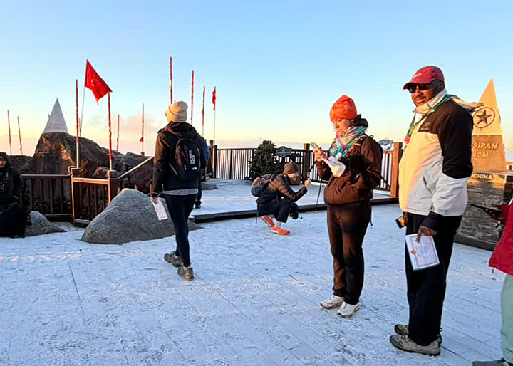 Tourists enjoy the frost on Fansipan peak, morning of 25/12. *Photo: Lan Huong.*