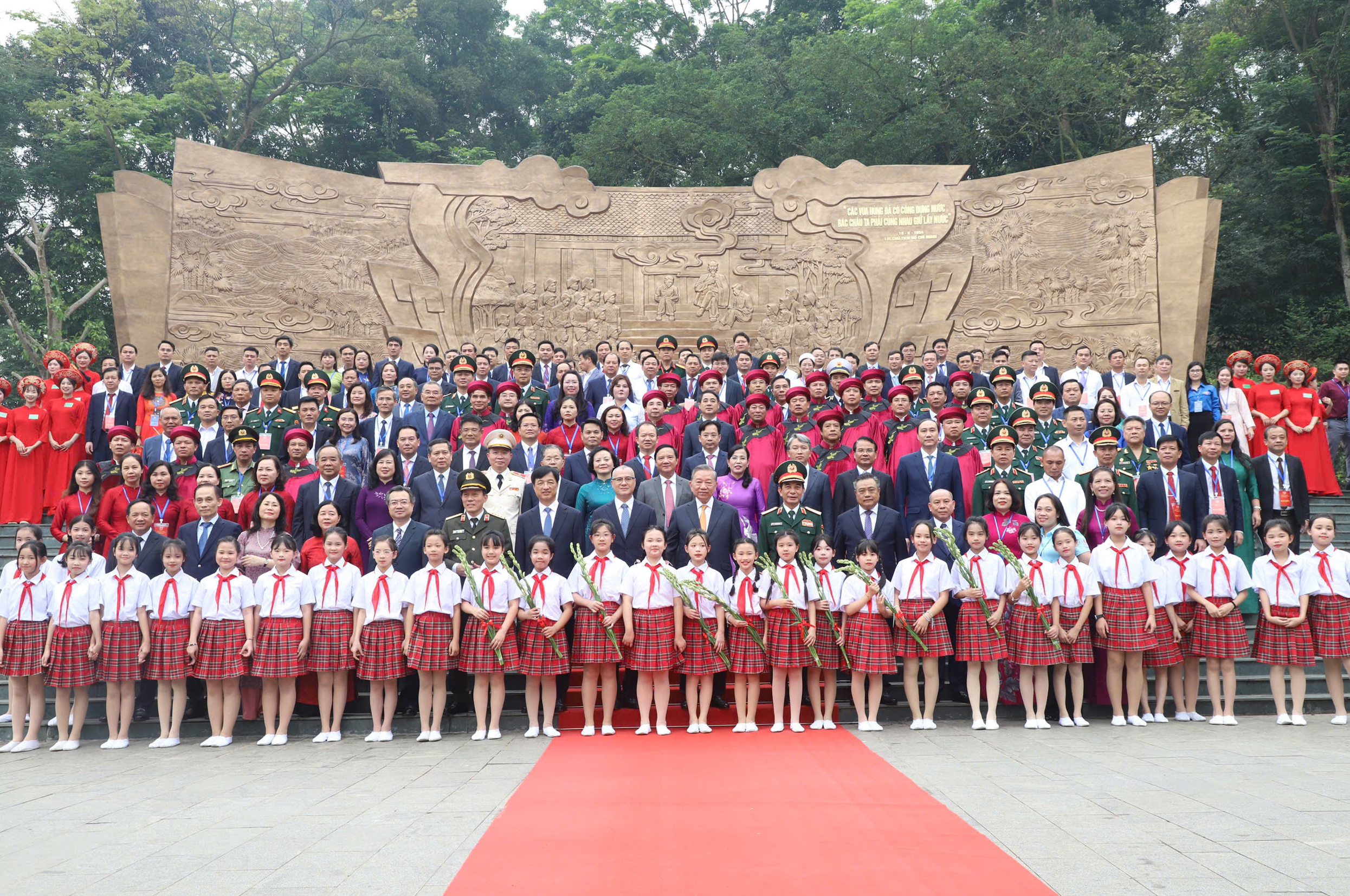Party and State leaders take a commemorative photo next to the relief "Uncle Ho talks with cadres and soldiers of the Pioneer Army Division" at the 5-way intersection of Gieng Temple. |