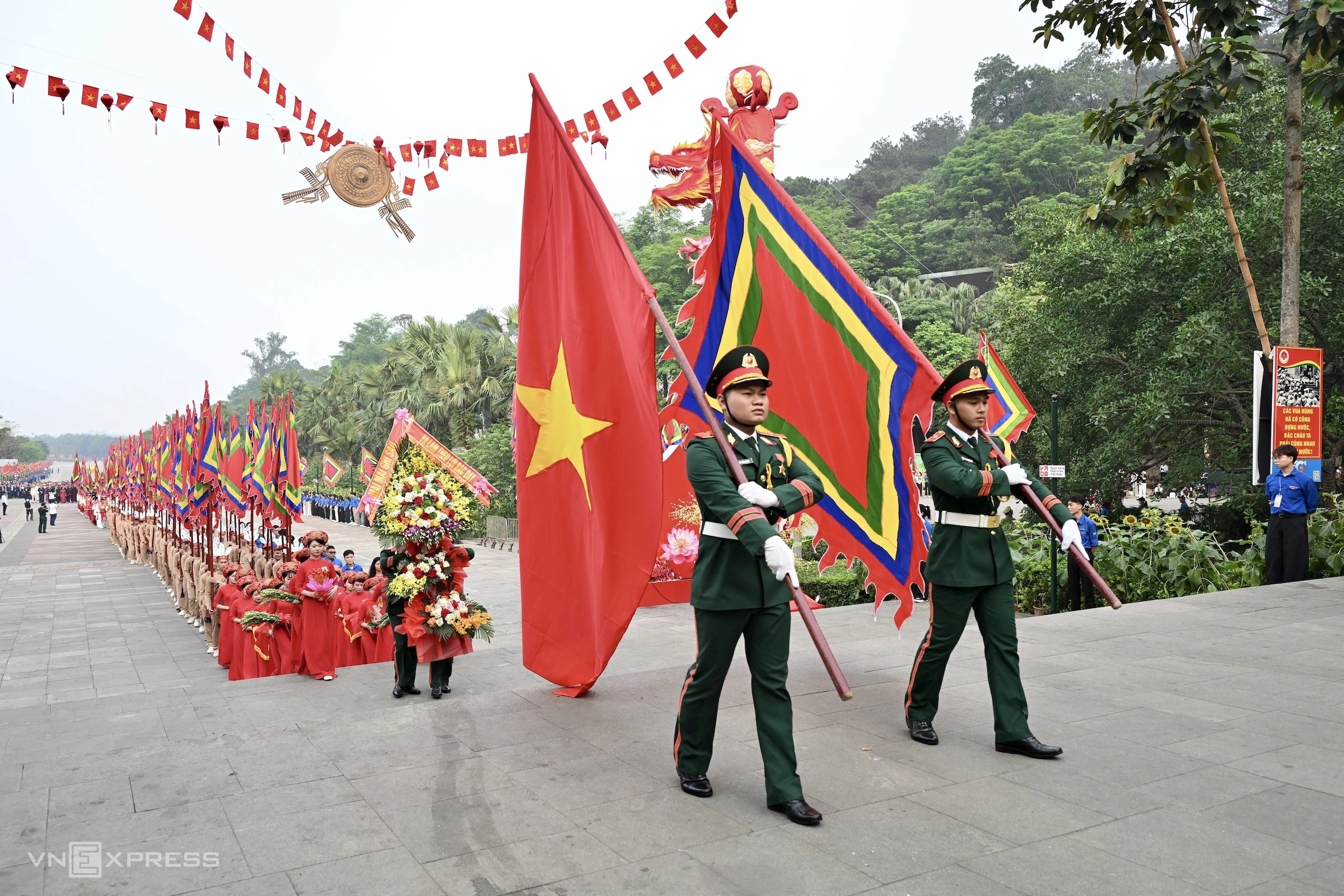 At 7h, the ceremonial procession, comprising Party and State leaders, honor guards, and representatives from associations and local authorities of Phu Tho province, began its ascent from the foot of Nghia Linh mountain to Hung Temple.