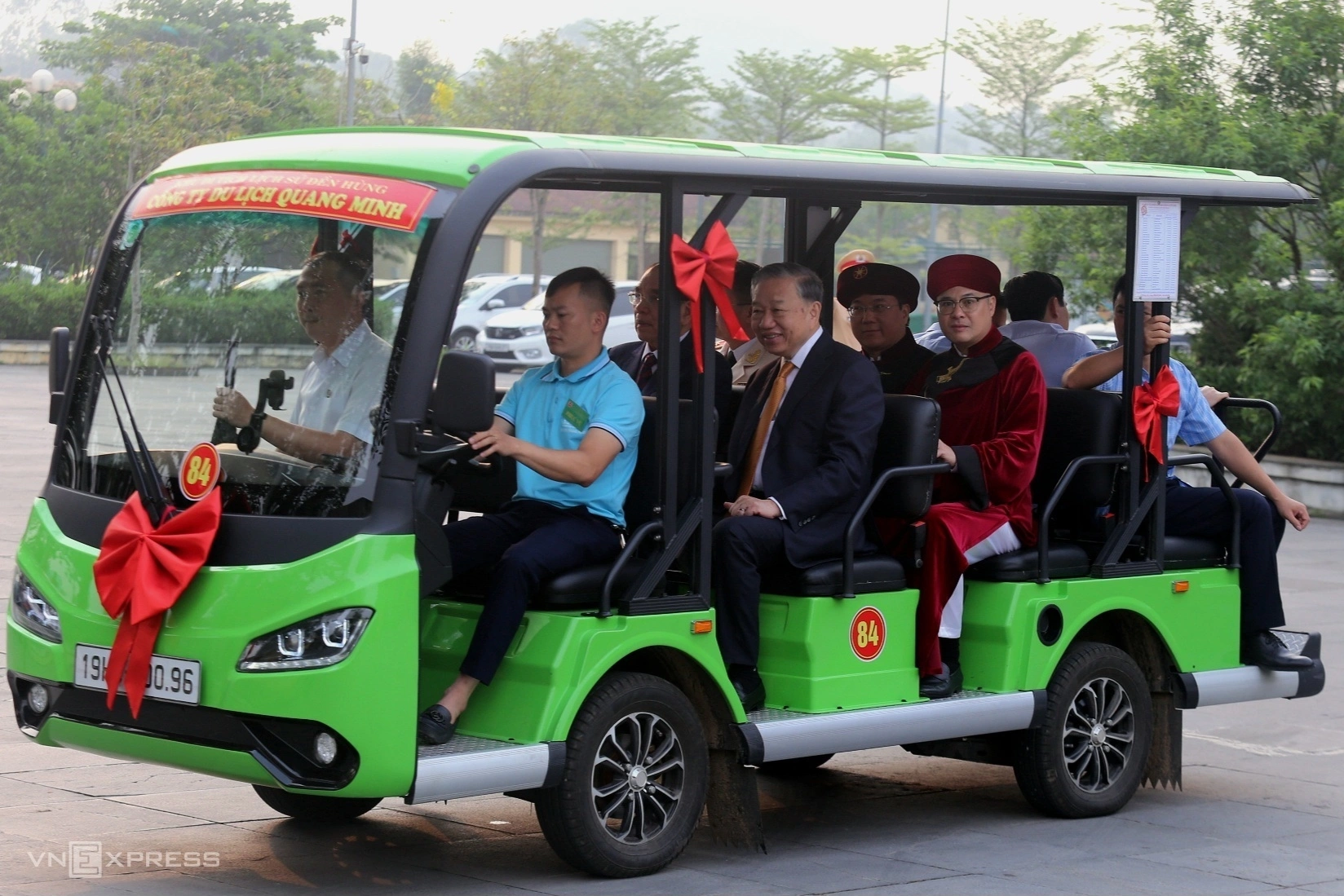 Differing from previous years, this year the delegation of Party and State leaders traveled by electric car from the management board building of the historical relic site to the assembly area at the base of Nghia Linh mountain.