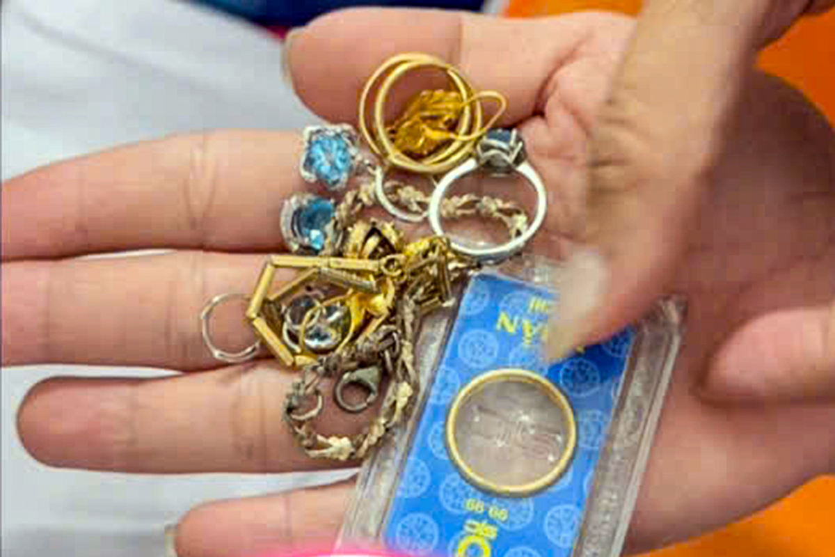 Two days prior, Lien and her team began sorting relief clothing. On the morning of 24/11, while packing the items, one small bag with "PNJ" printed on it unexpectedly fell out. Inside were a pair of rings, earrings, and gold bars.