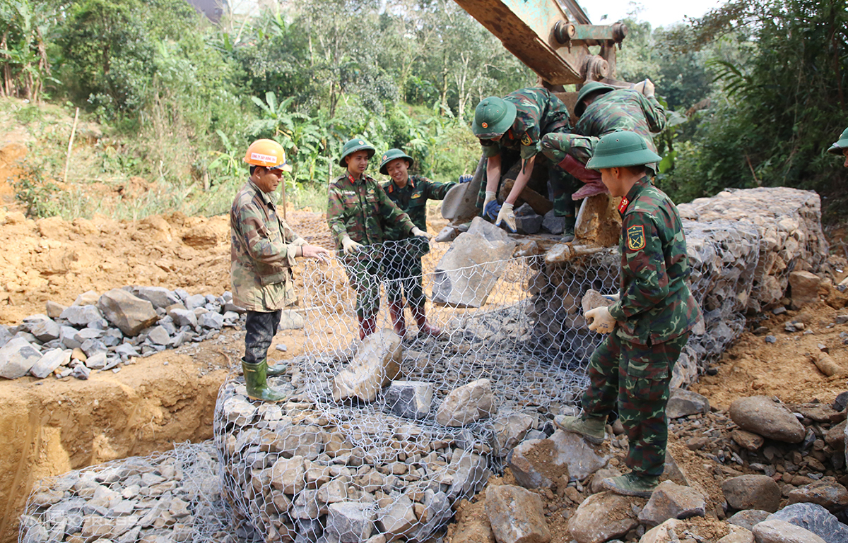 Soldiers constructing a retaining wall with rock gabions on the afternoon of 27/12 to prevent further landslides. Photo: Dac Thanh |