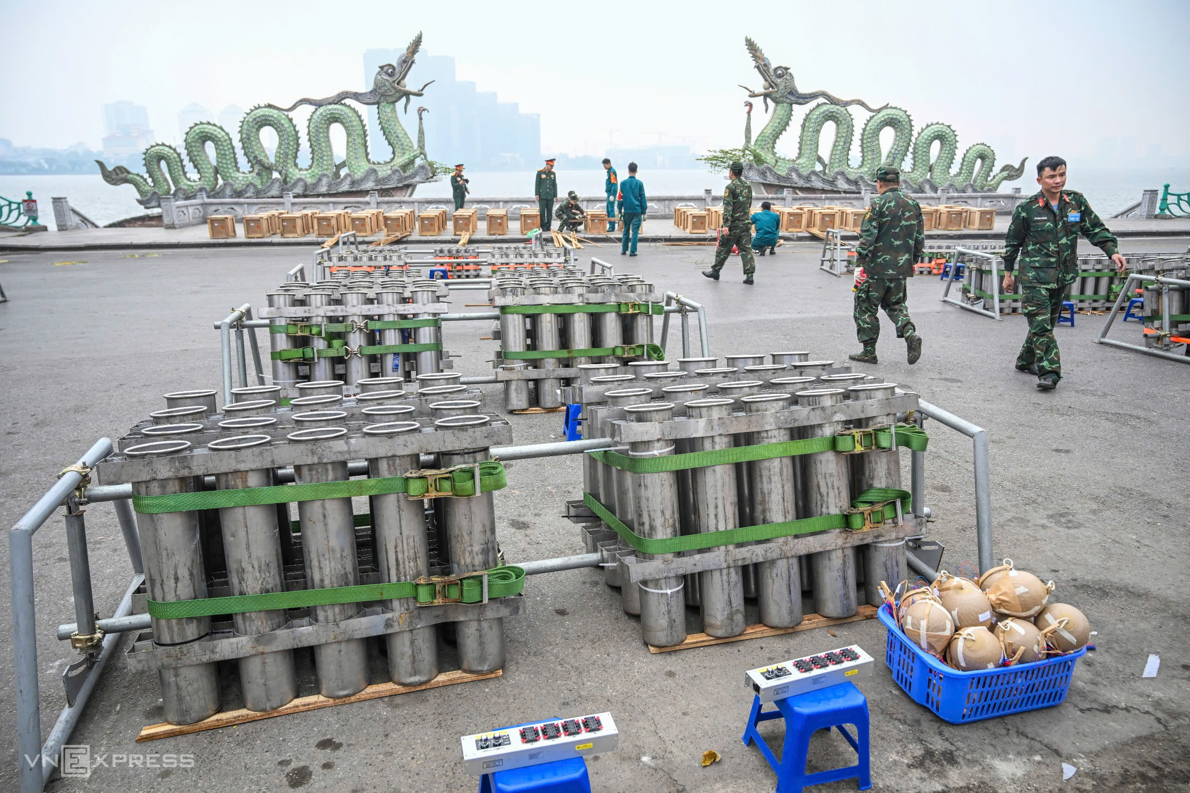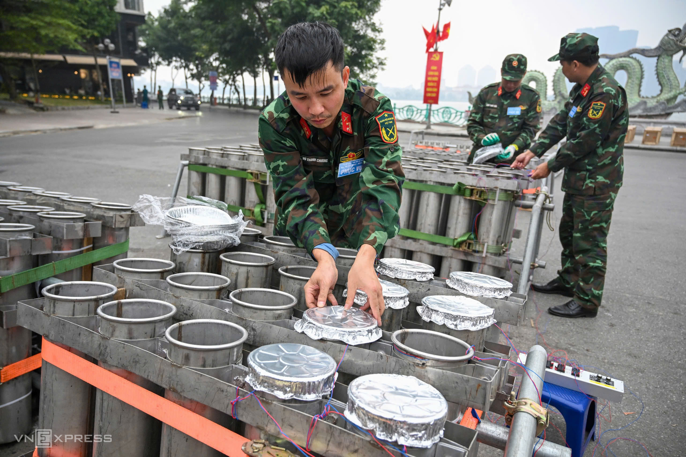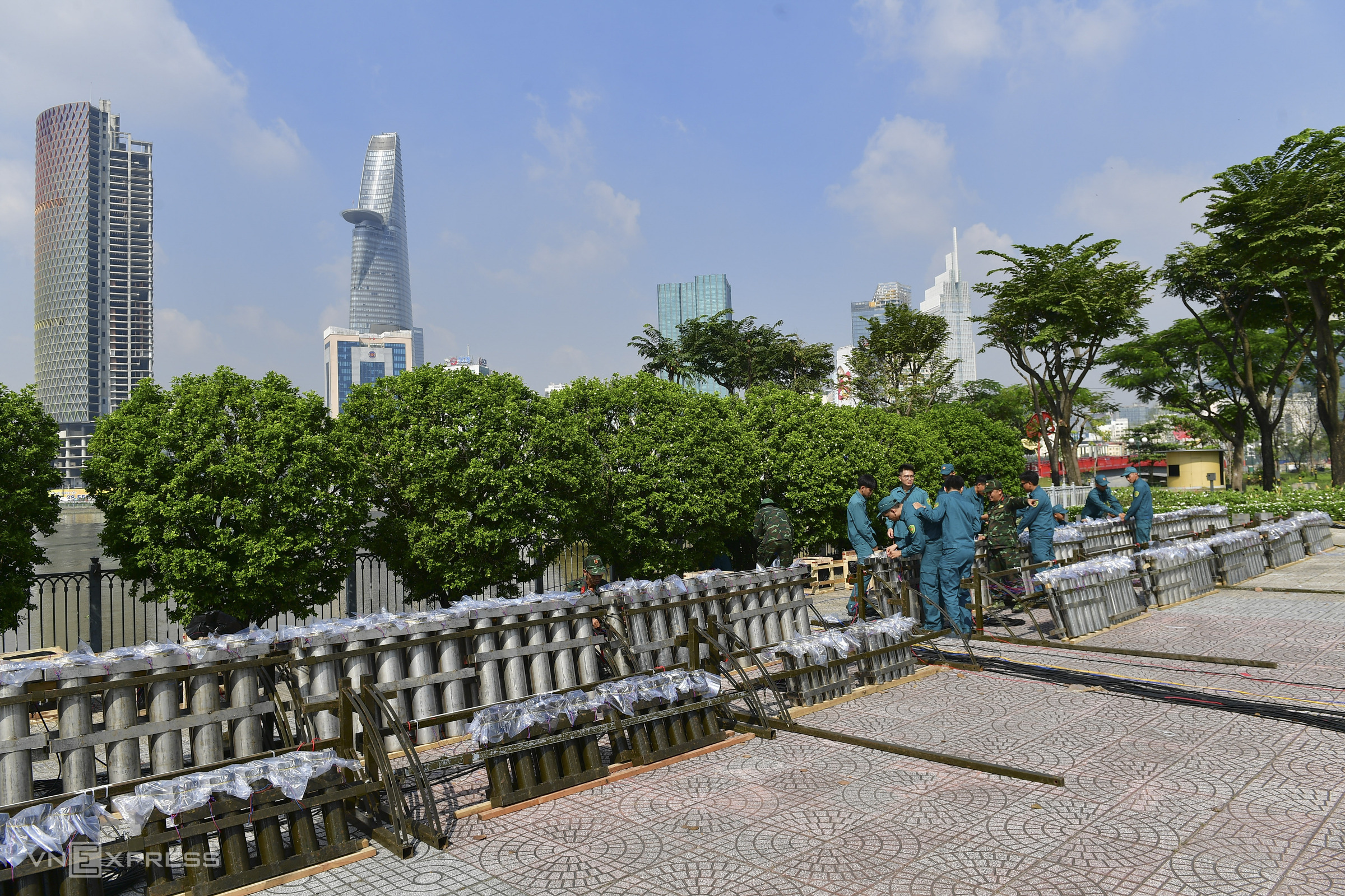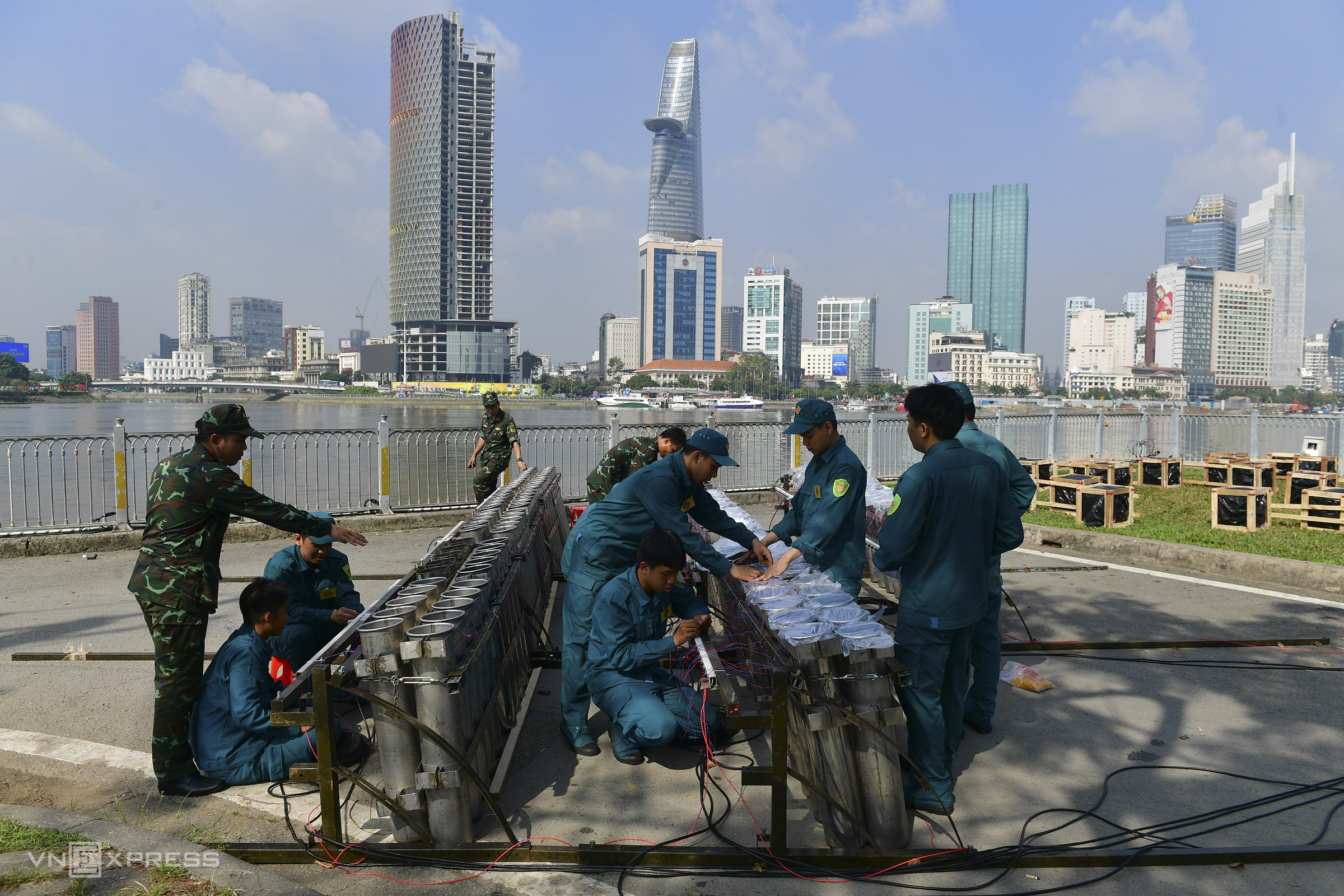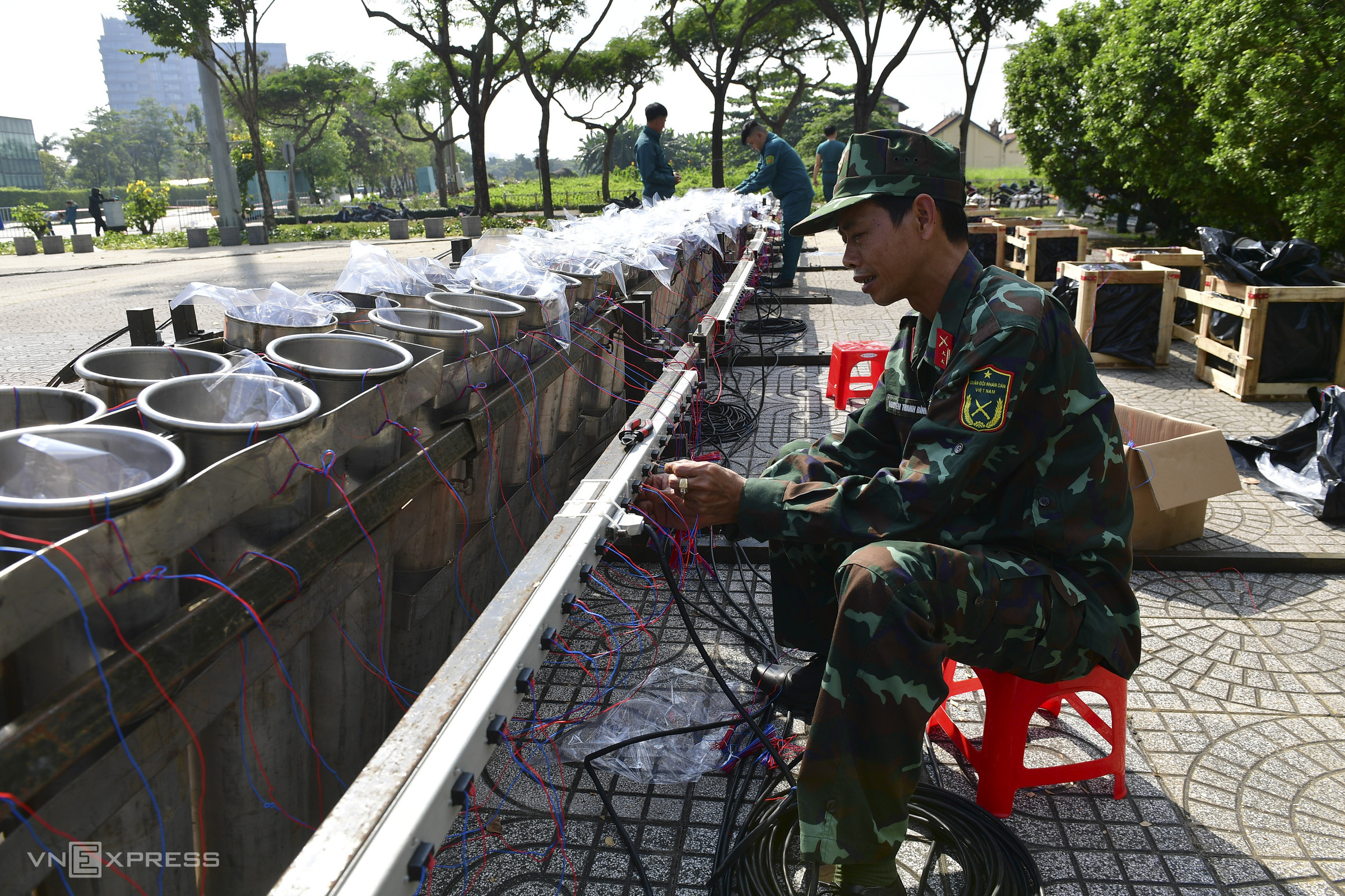 in ho chi minh city, soldiers prepared pyrotechnic racks for about 1,300 fireworks at the Sai Gon River Tunnel entrance in An Khanh ward.