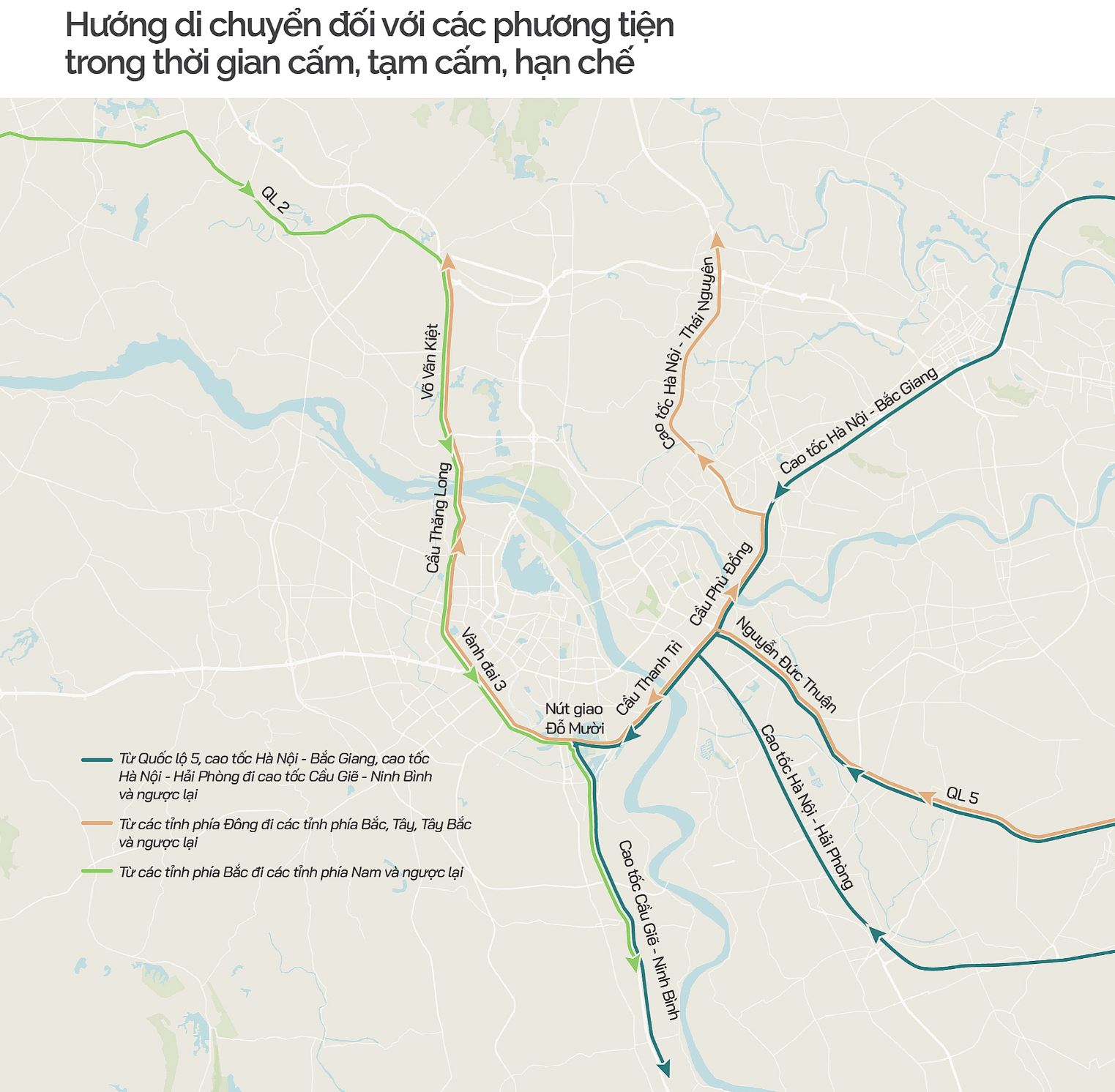 During the road closures and restrictions, Hanoi police have established detours for restricted vehicles. Vehicles from National Highway 5, the Hanoi-Bac Giang Expressway, and the Hanoi-Hai Phong Expressway heading towards the Cau Gie-Ninh Binh Expressway should travel via Thanh Tri Bridge - Ring Road 3 Elevated Section - Do Muoi Intersection - Cau Gie-Ninh Binh Expressway.