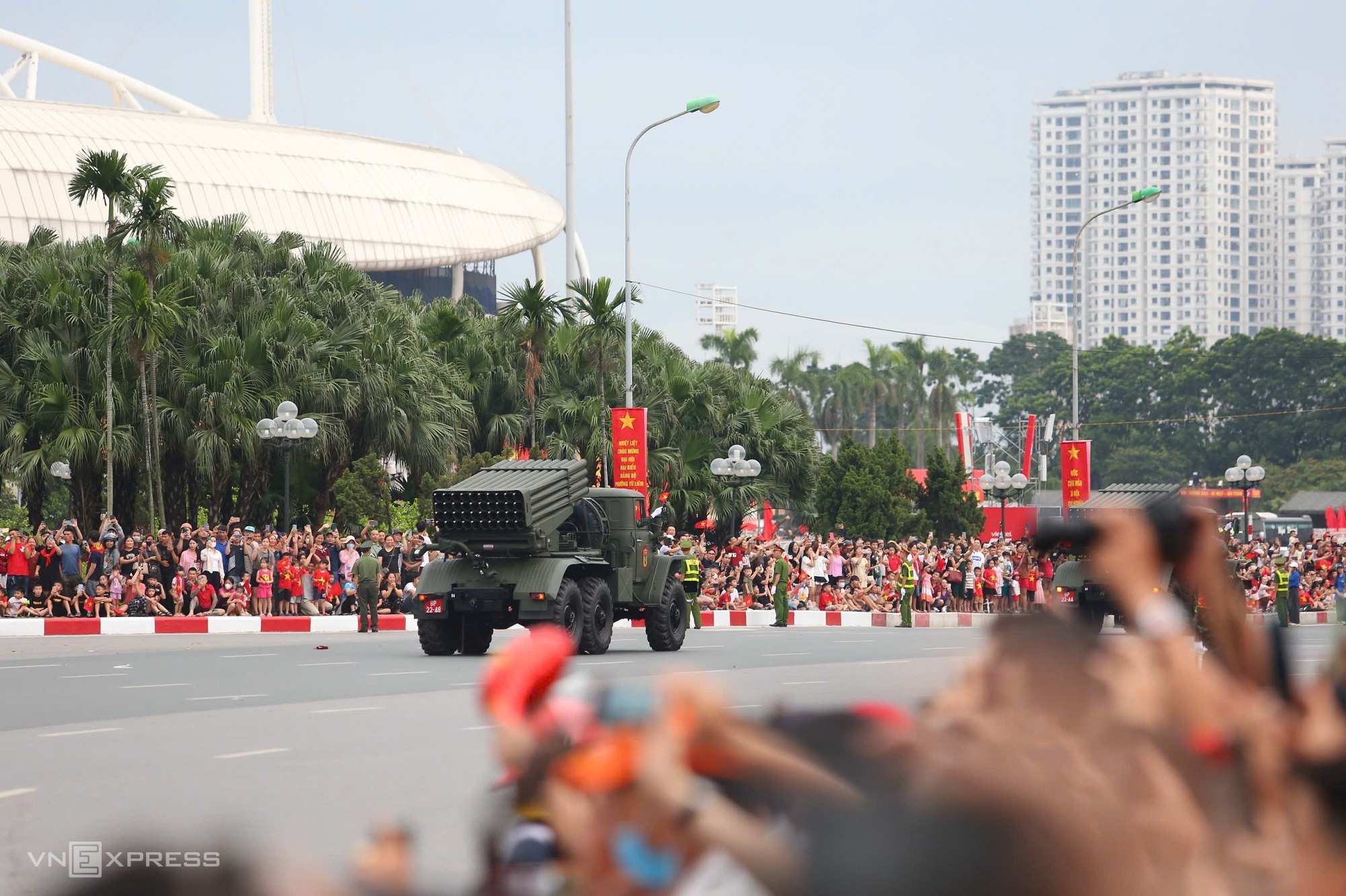 People lined Le Quang Dao Street to watch the convoy of military vehicles leave the F1 racetrack for Ba Dinh on 24/8. Photo: Viet An