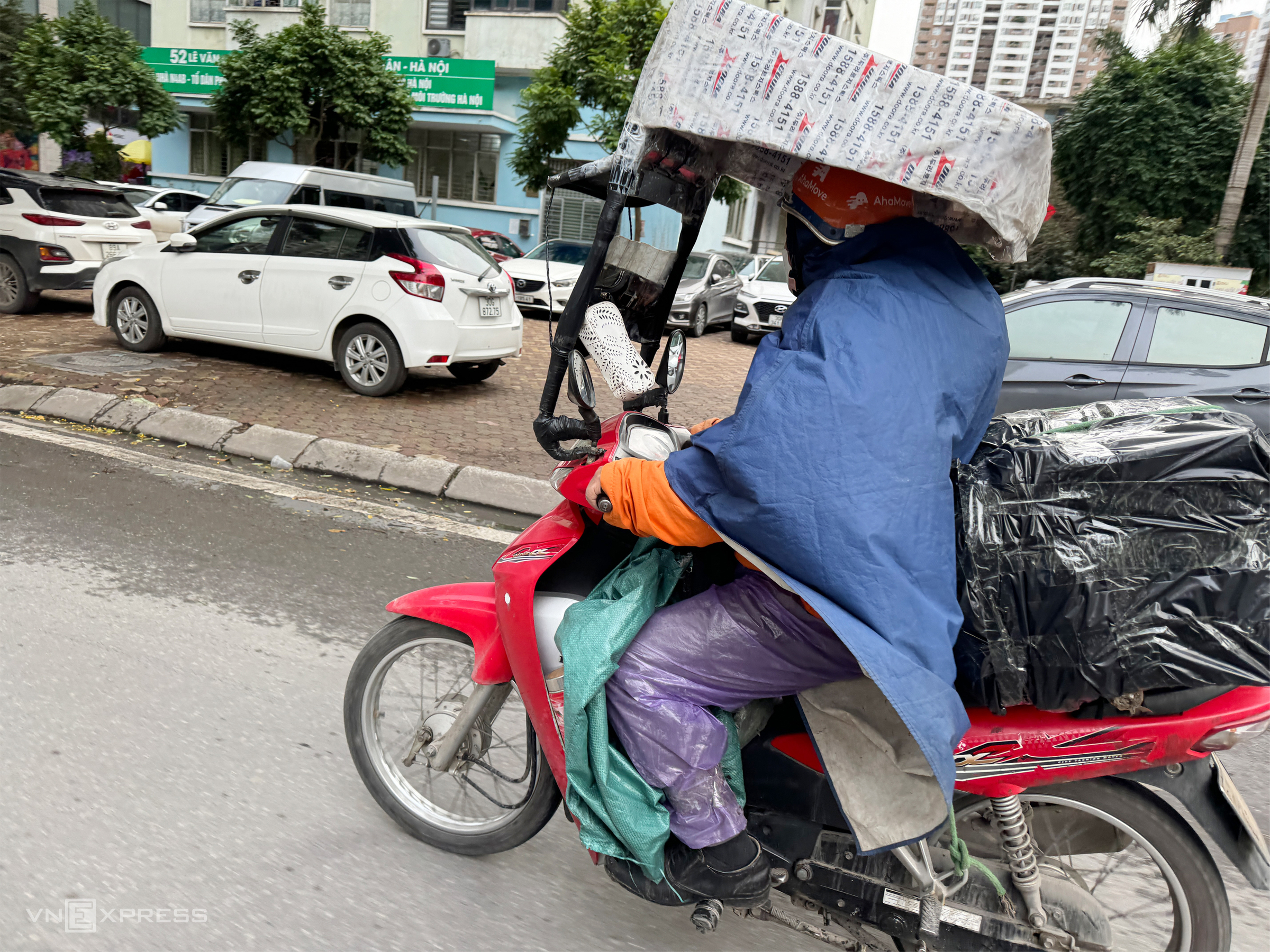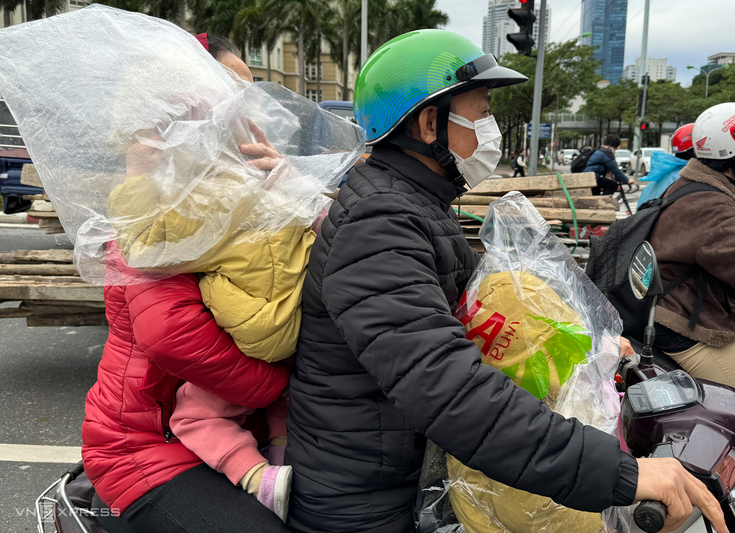 On Me Tri Road (Tu Liem Ward), many parents used raincoats and plastic bags to shield their children on their way to school. Hanoi this morning was cold with light rain, intensifying the biting chill. *Thanh Hai* |