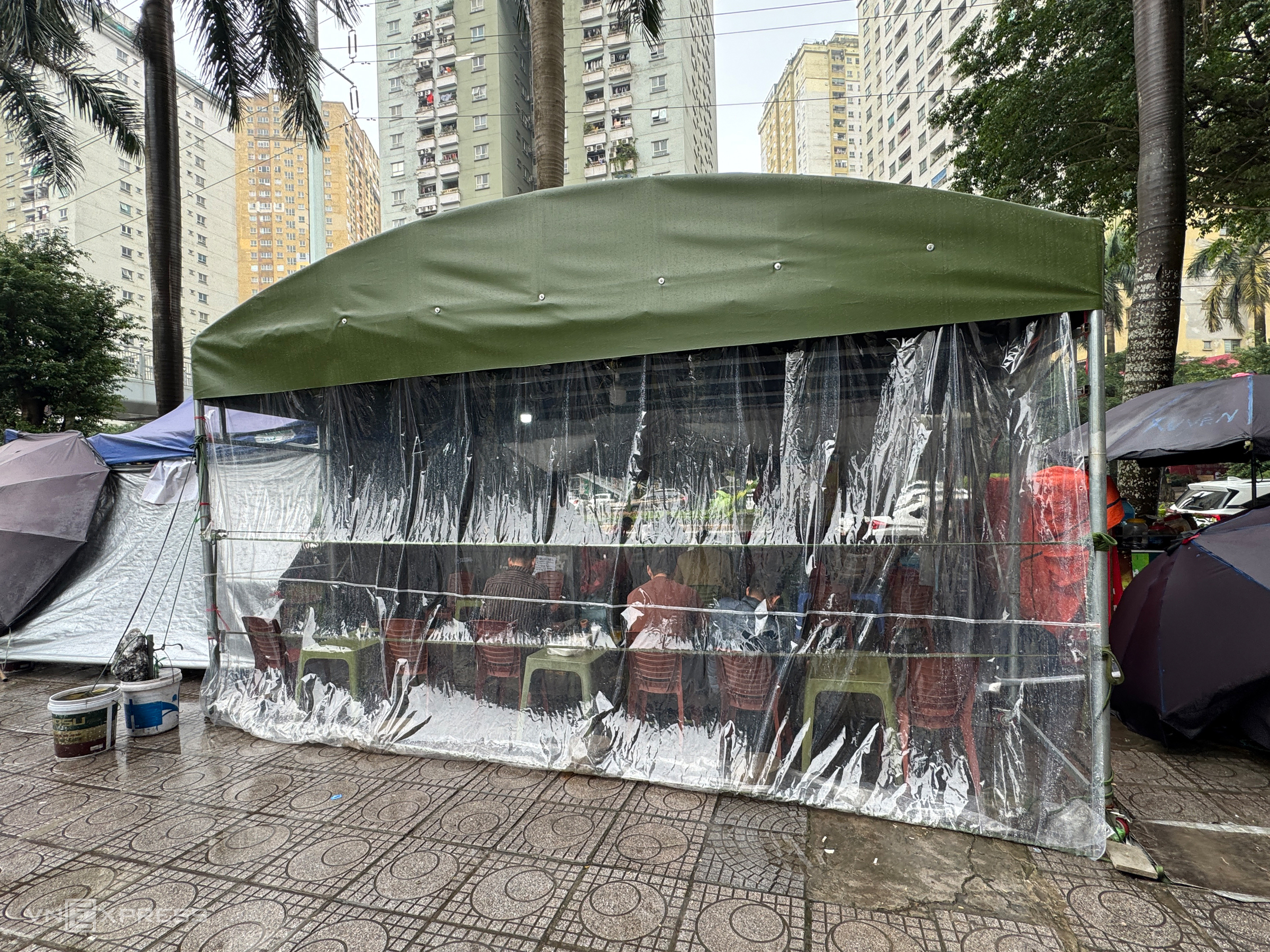 Some temporary stalls in the urban area of Ha Dong Ward were enclosed with plastic sheeting around iron frames to block the wind, keeping customers inside warm. *Thanh Hai*