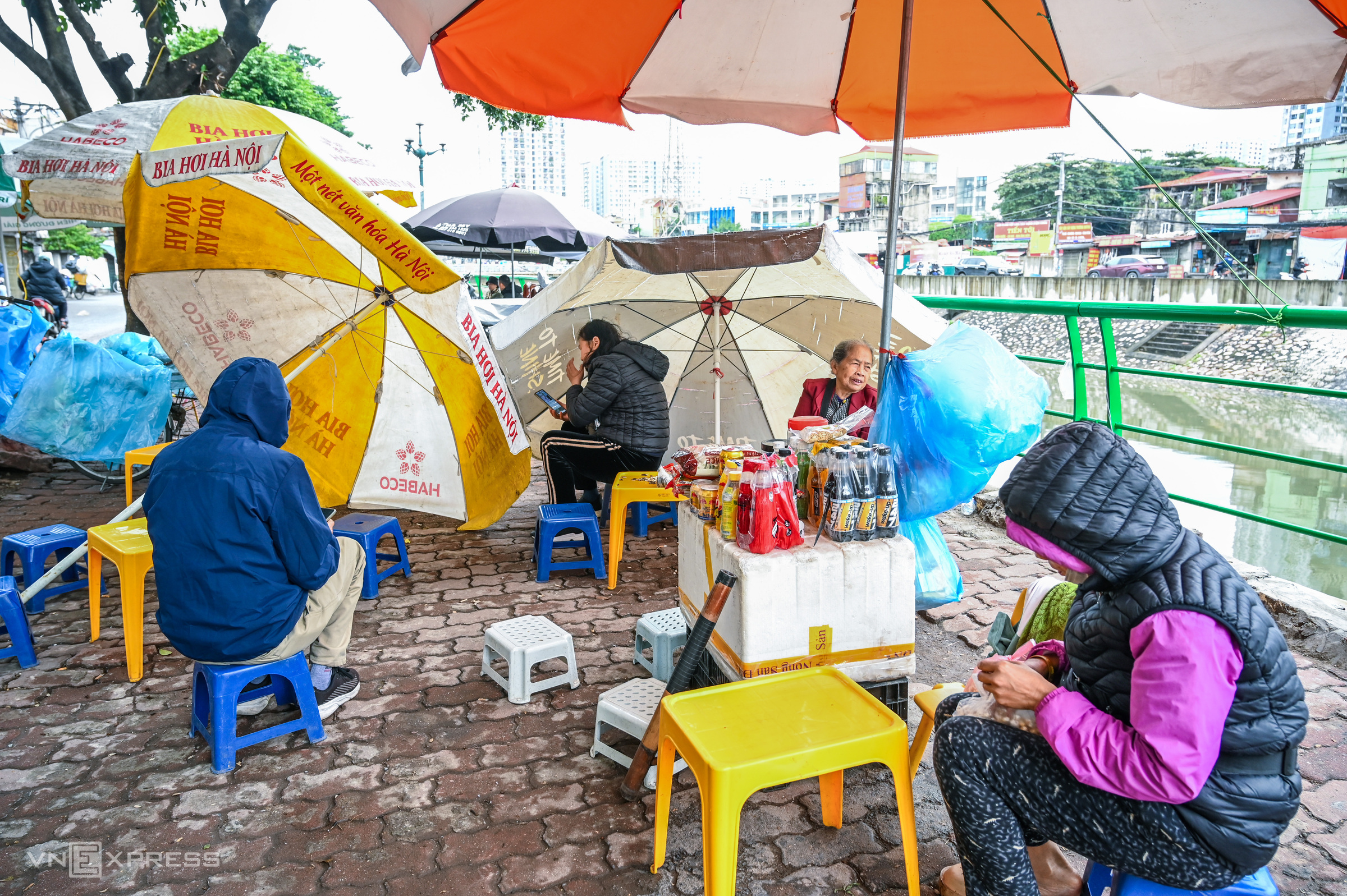 Ms. Nguyen Thi Loan's drink stall, located by the Kim Nguu River, used an umbrella to shield customers from the cold wind. |