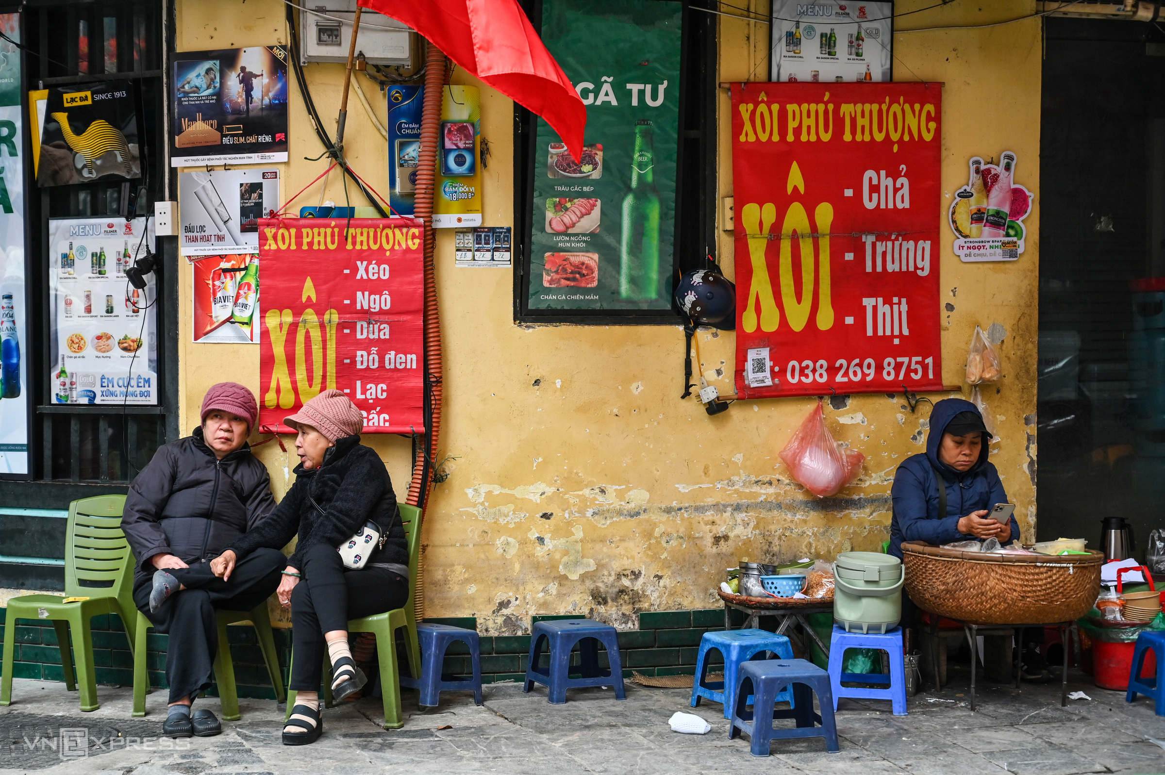 Ms. Hoa, a morning sticky rice vendor, noted that customers primarily bought food for takeaway rather than dining in, unlike other days. |