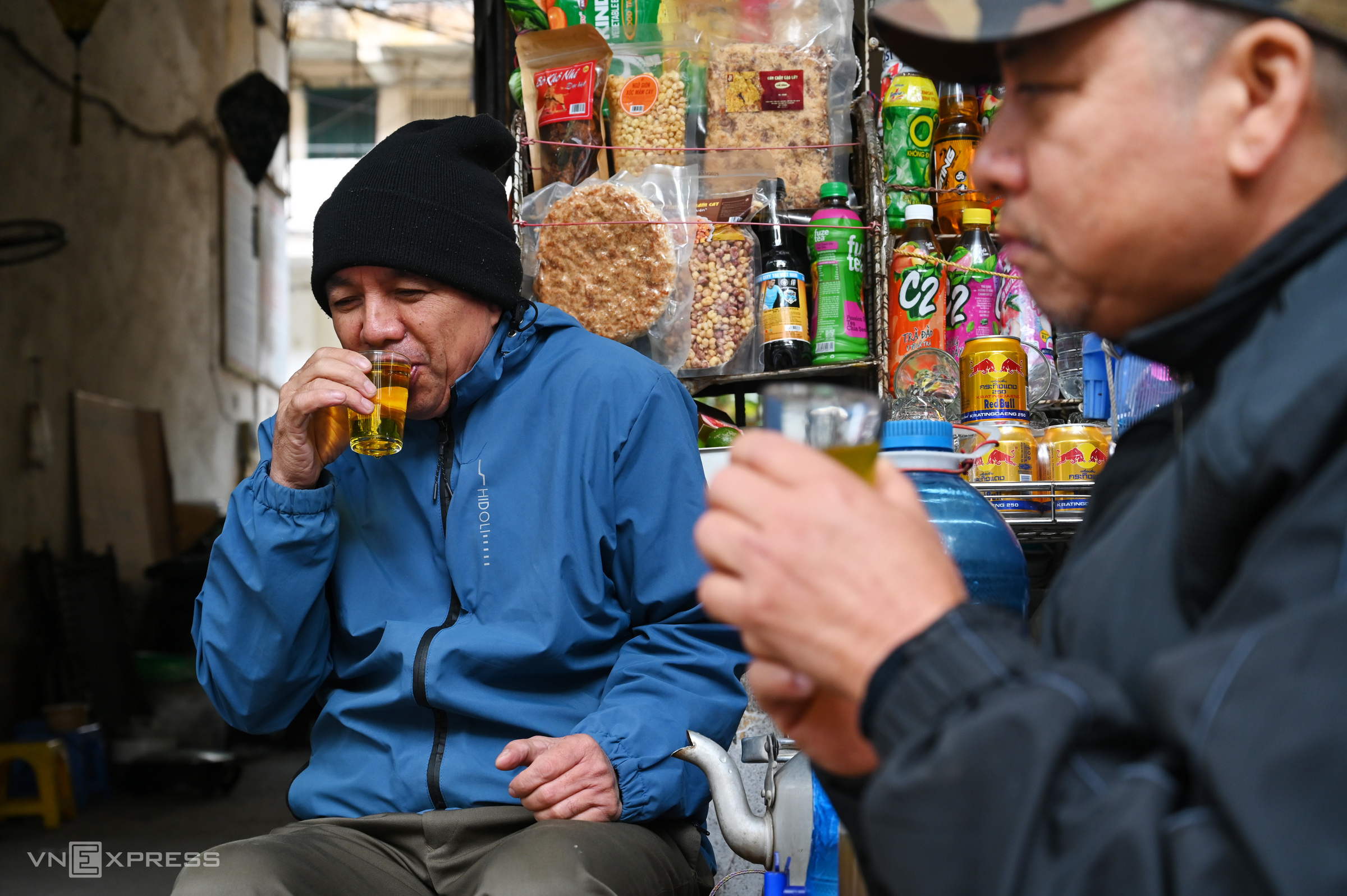 Mr. Long, owner of an iced tea stall on Tam Trinh Street (Linh Nam Ward), said he lights a fire for customers to warm up while drinking when the weather turns cold. |